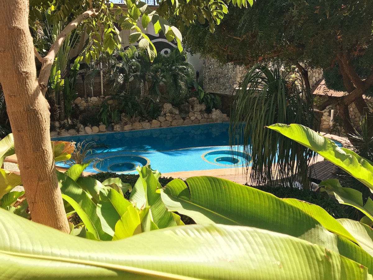 This unique and fresh apartment will make you feel at home! Enjoy your freedom and privacy in your kitchen and living space - and/or share some special memories in the hammock on our sunset terrace & chilling by the pool in the shade with others. All that 50m above sea level, but just steps away from hiding your toes in the sand, or savoring fresh juices, typical food or whatever else your heart desires in the many restaurants just down the road.