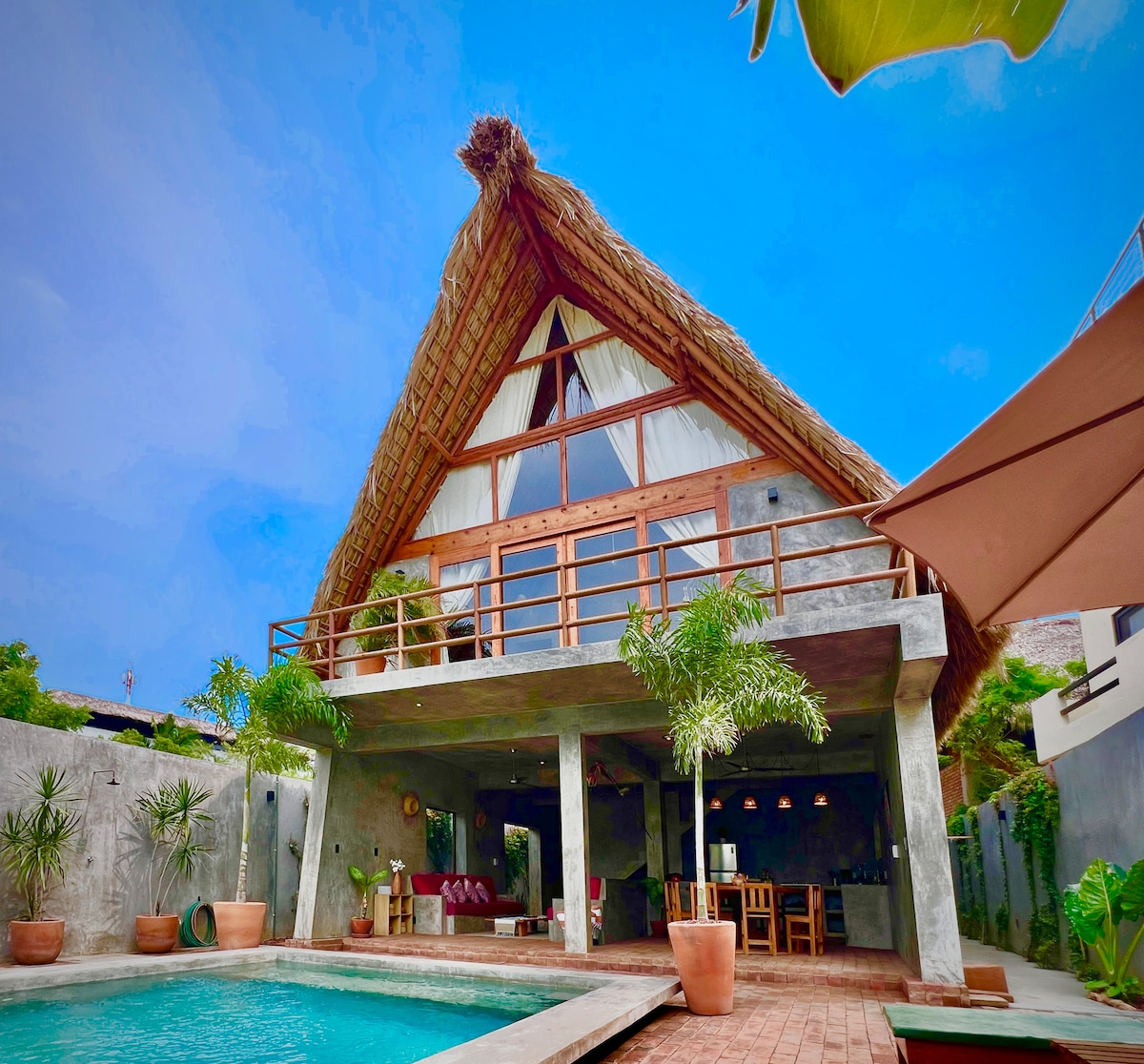Hermosa Villa en la zona turística de la Punta de Zicatela, a dos cuadras del mar, rodeada de la vida bohemia de la zona encontrarán varios restaurantes, tiendas y bares de playa. La Villa cuenta con una habitación principal y su baño completo en el interior y una mezzanine abajo de la palapa con puerta corrediza, con baño en planta baja, ambos espacios con aire acondicionado. Tendras una cómoda sala para una rica cena ! Lo que más van a disfrutar es su pequeña alberca después de la playa.