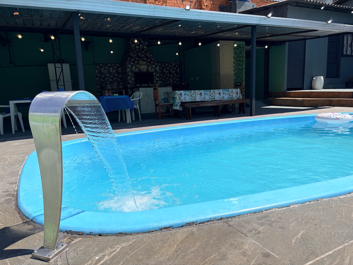 Leve toda a família a este ótimo lugar com muito espaço para se divertir como área de jogos, piscina e gourmet para churrasco. Quartos muito aconchegantes, cozinha e copa de alto padrão e sala grande para descanso. Acomodações são: - Uma suíte com closet; - Um quarto com cama de casal + solteiro; - Um quarto com cama de casal; - Um Banheiro completo entre os quartos; - Uma sala com sofá bicama de solteiro ou casal; Quartos, sala e aérea de jogos climatizados! Contém dois colchões solteiro extra!