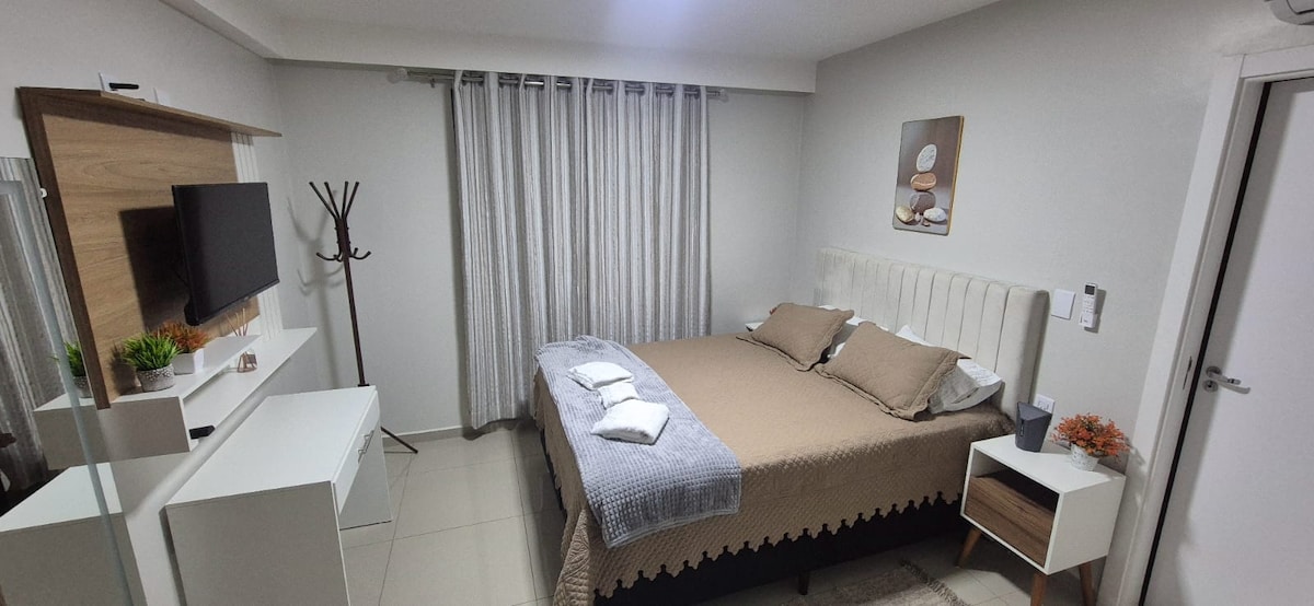 Studio novo muito bem localizado com: ar condicionado que cobre todo ambiente além de wi-fi e smart tv Ideal p/ até 2 pessoas, roupa de cama e toalhas de banho são fornecidas O banheiro possui toalheiro térmico Fácil acesso às famosas Cataratas do Iguaçu e a fronteira com o Paraguai Algumas distâncias: 6,6km Ponte da Amizade - Paraguai 8,5km Ponte Tancredo Neves- Argentina 13,0km Centro Visitantes Itaipu Binacional 14,8km Parque das Aves 15,1km Centro de visitantes Cataratas de Iguaçu