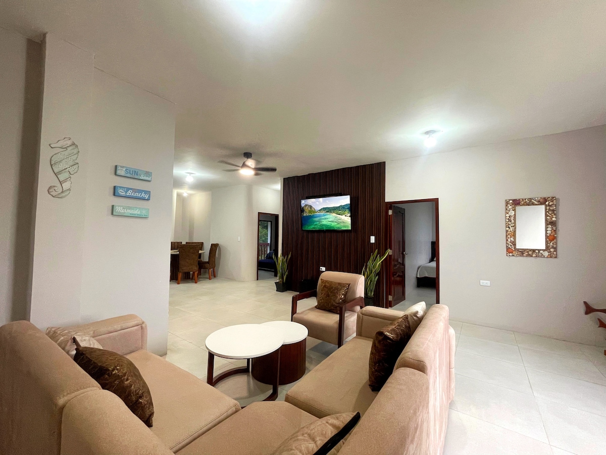 Relájate en esta escapada única y tranquila rodeados de una decoración inspirada en los tonos del mar, contemporáneo y cómodo. El apartamento cuenta con 3 dormitorios, 2 baños completos y un espacio de parqueo. Una cocina equipada con refrigeradora, utensilios de cocina y vajilla. Dispone de 1 cuarto master con cama queen y baño privado, 2 camas full y una cama twin xl, baño social. La sala cuenta con un sofá cama y un smartv de 50 pulgadas, el comedor cuenta con una mesa de 4 puestos.