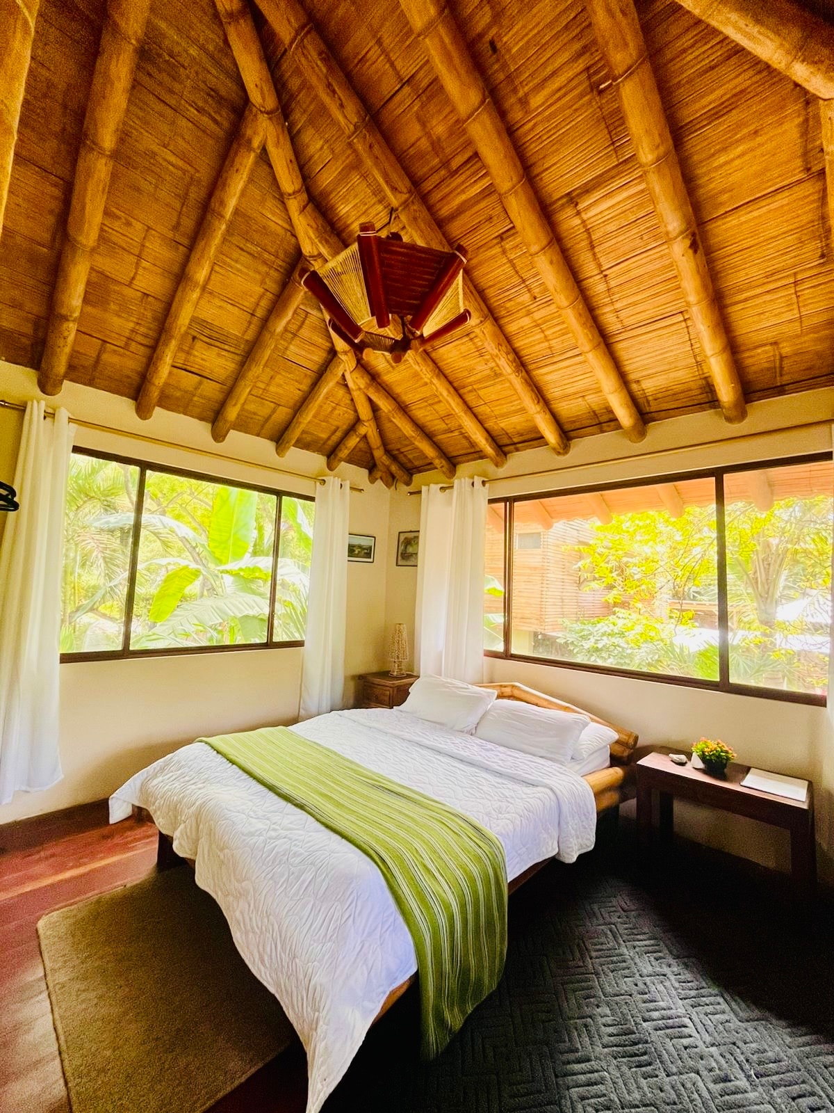 Encantadora suite de dos plantas subida con gradas con balcón, cama matrimonial, con colchón Chaide& Chaide, escritorio para trabajar, baño privado con agua caliente, ventanales grandes con mucha claridad, ingreso de aire para toda la suite, en la planta baja cocina equipada, con mini nevera, comedor, internet. Ubicada en un entorno de jardín-selva, con fauna nativa y naturaleza de perfecta armonía con “OASIS” jacuzzi privado, BBQ, saltarín , zona de yoga, parqueadero privado y seguro.
