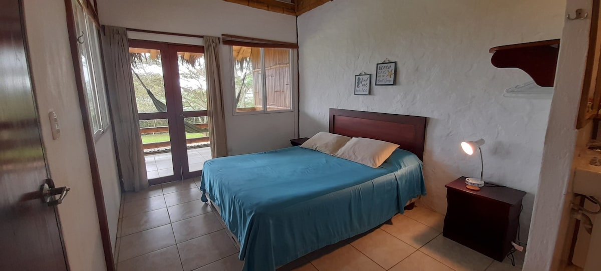 Habitación en planta baja con una cama matrimonial y dos literas de 1.5 plazas, ideal para grupos o familias de hasta 6 personas. Tiene aire acondicionado, baño privado funcional, Smart TV con Netflix, estante tipo armario y colgador de ropa. Cómoda y bien ventilada. Acceso libre a piscina, cocina, parrilla, jardines, hamacas y más. A solo 7 minutos de la playa y del centro de Montañita, pero alejado del ruido. Tranquilidad y espacio para compartir.