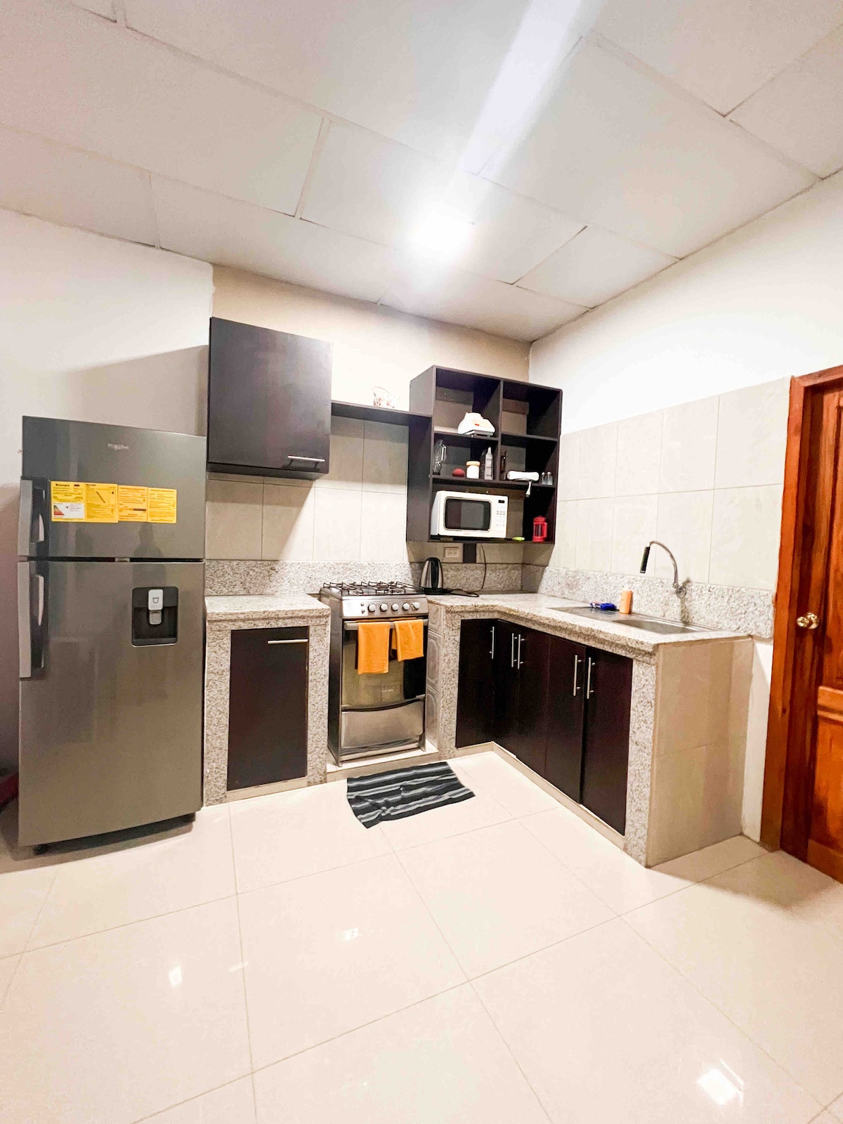 El departamento es de un solo ambiente (34m2 sin la terraza), con entrada independiente, cuyo acceso se hace por una escalera de exterior. Presenta una amplia terraza privada de madera, con linda vista al mar y hamaca. El baño es muy amplio, la kitchenette equipada con nevera (con congelador), cocina de 4 quemadores, olla arrocera, cafetera y tetera, todo lo que se necesita para su estadía. La conexión WiFi es de muy buena calidad, ideal para las personas que trabajan en línea. Muy seguro.