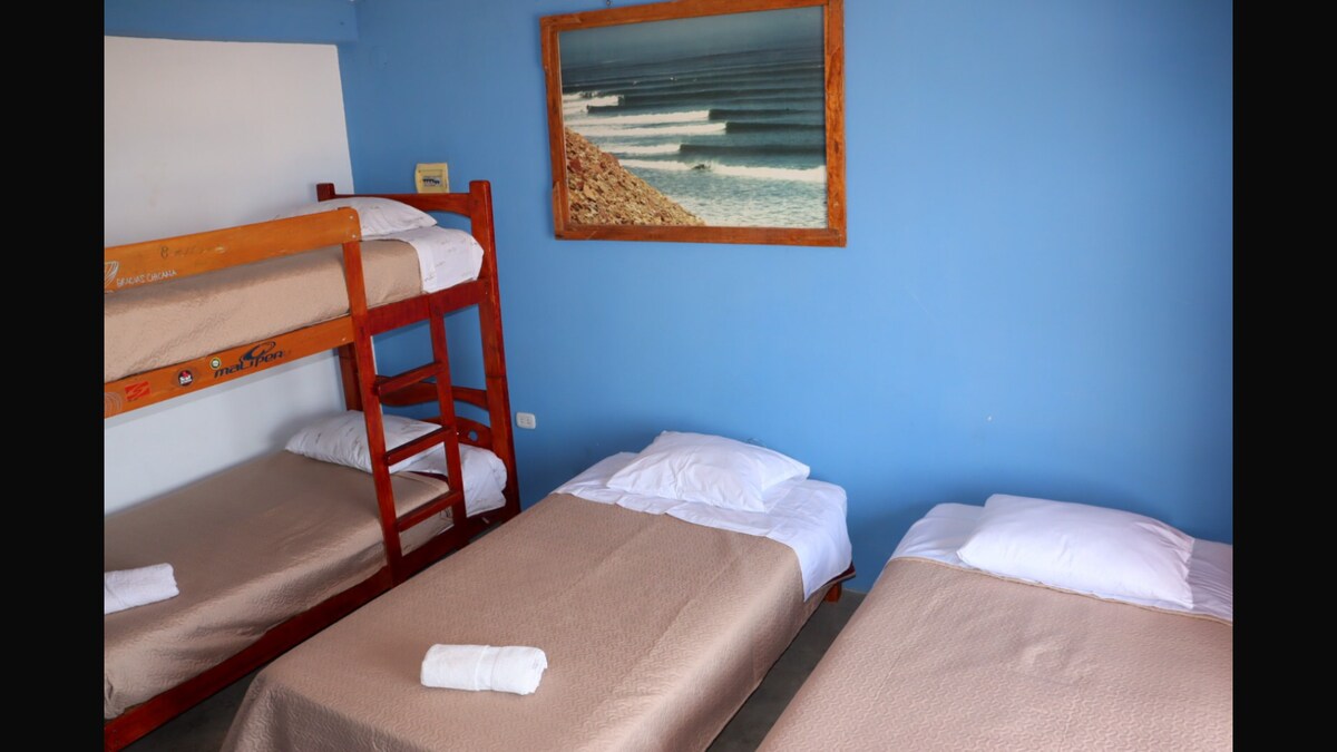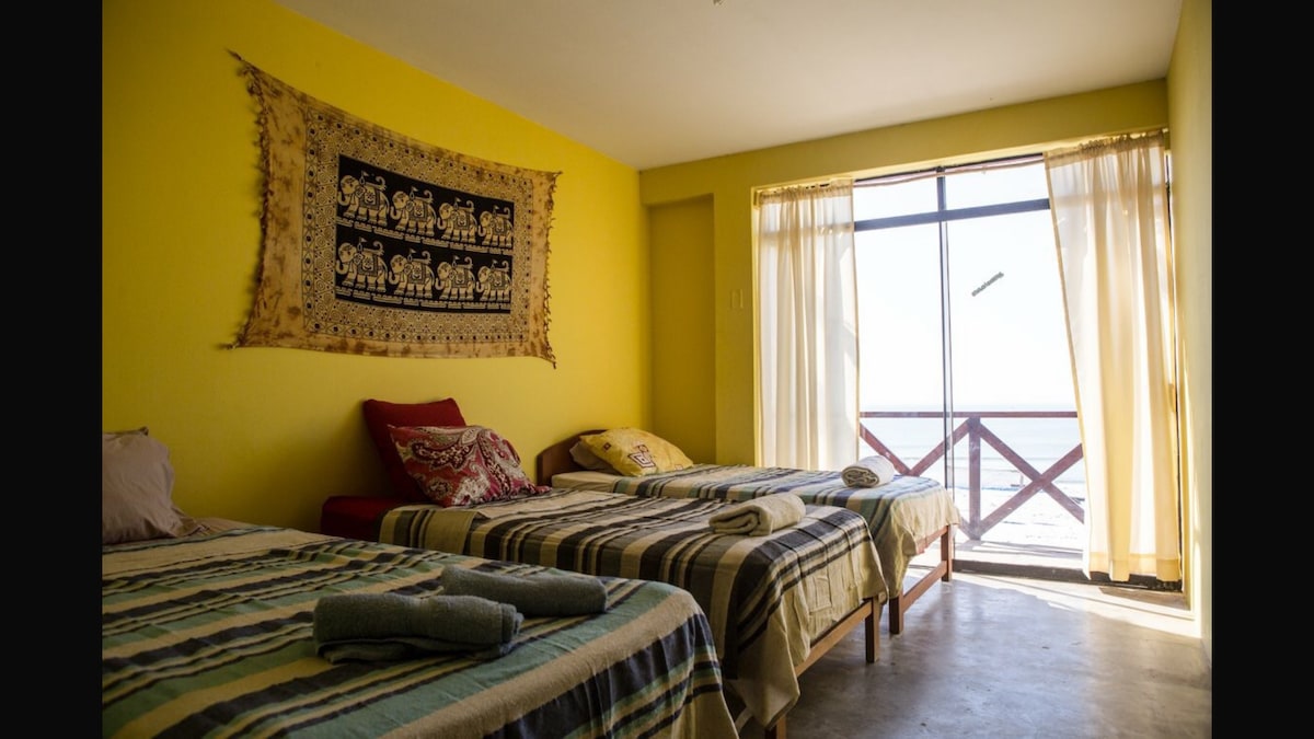 Relájate con tu familia o amigos en esta increíble casa ubicada frente al malecón y la playa de Chicama - Puerto Malabrigo. Contamos con 5 habitaciones (cada una con baño privado): - Principal: cap. 3 personas (1 cama king + 1 cama ind) - Matrimonial: cap. 2 personas ( 1 cama doble) - Doble: cap. 2 personas (2 camas ind) - Doble: cap. 2 personas (2 camas ind) - Triple: cap. 3 personas (3 camas ind)