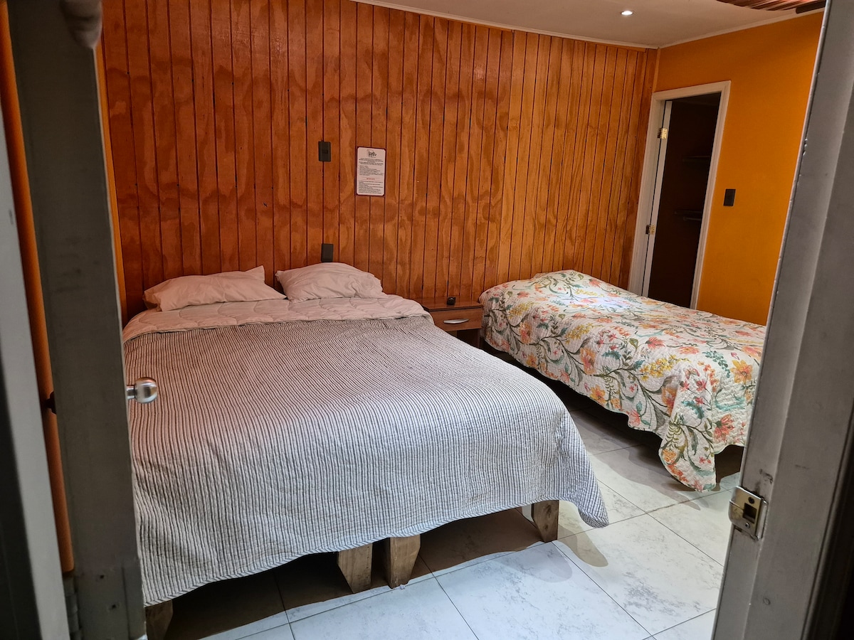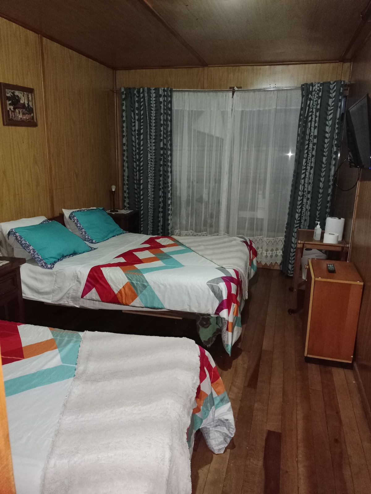 Habitación para 4 personas, cuenta con 1 cama de 2 plazas y 2 camas de 1 plaza. Además de baño privado, calefacción y TV. Nuestro Hotel cuenta con estacionamiento privado a todos nuestros huéspedes gratis, desayuno y aseo opcional con cargo extra.