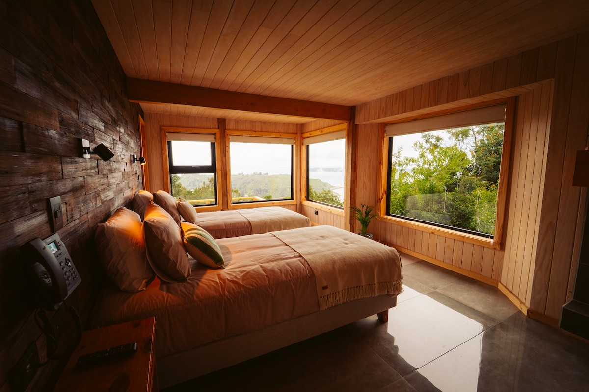 ¡Escápate a esta suite de lujo diseñada para el descanso total! La habitación cautiva con sus impresionantes ventanales de piso a techo que ofrecen vistas panorámicas inigualables a la naturaleza y el mar. Lo más especial es su tina independiente junto a la ventana, perfecta para relajarse mirando el paisaje. Disfruta de la calidez de la chimenea moderna bajo hermosos techos de madera con vigas a la vista. Incluye zona de estar, frigobar y un baño elegante con doble lavabo y ducha moderna.