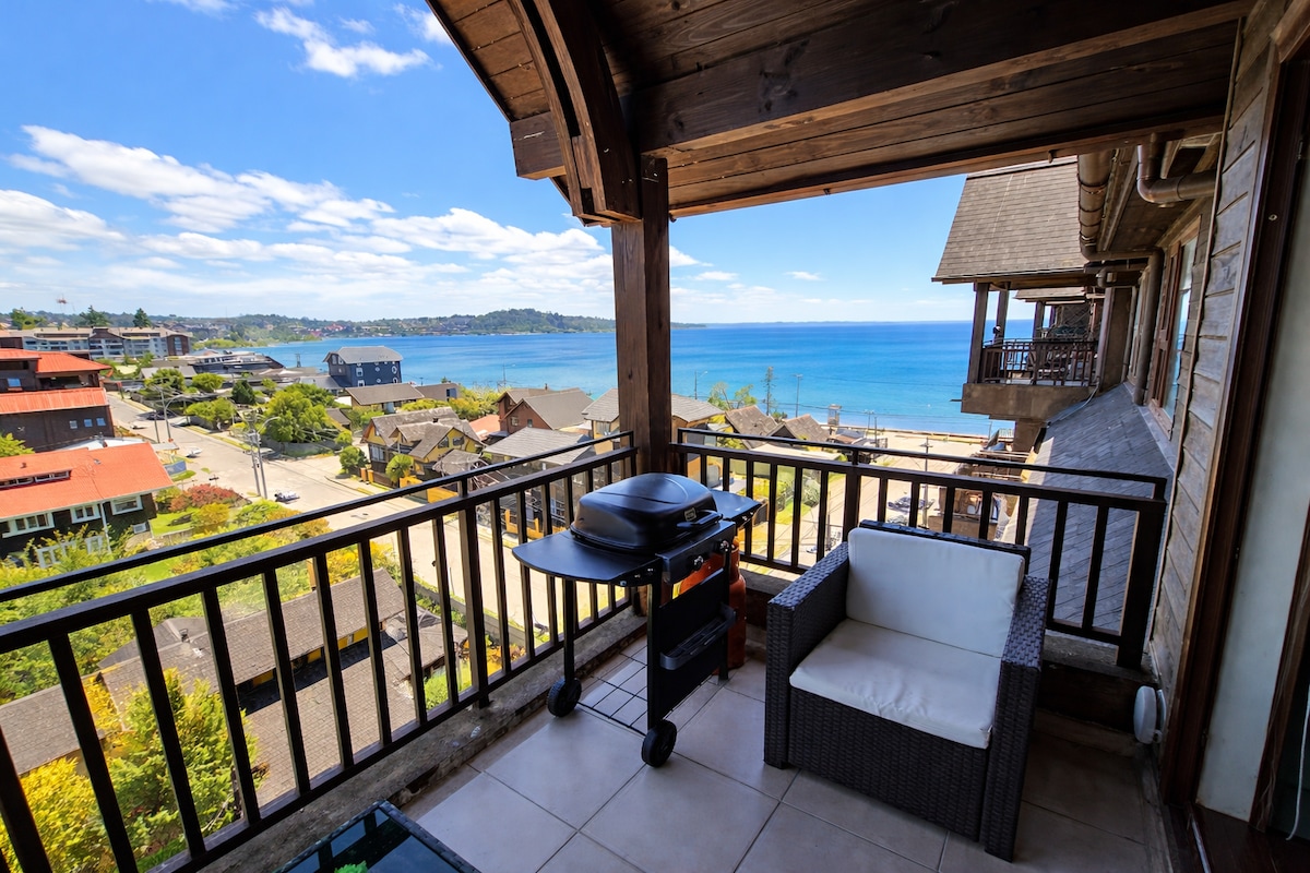 Espectacular departamento. Con la mejor vista al lago Llanquihue. Es un alojamiento nuevo, moderno y exclusivo. Con una habitación y una sala de estar, comedor y una cocina totalmente equipada. Todo esta pensando para que tengas la mejor estadía y las mayores comodidades. La ubicación es inmejorable a solo pasos a la costanera de la playa del lago Llanquihue. Con una hermosa vista a los volcanes "Osorno y Calbuco". Un condominio muy tranquilo y seguro.