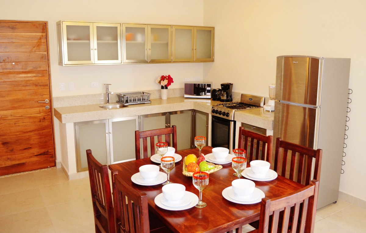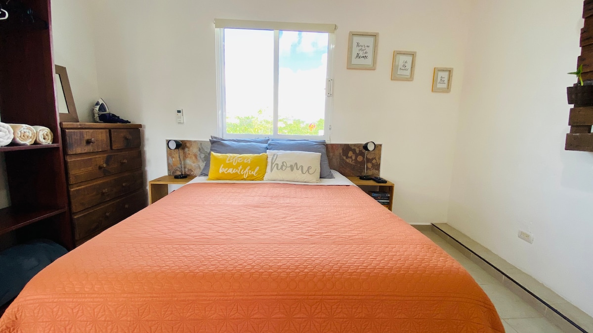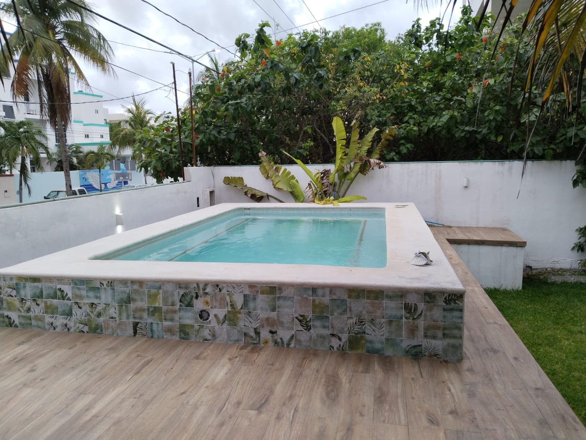 Forget your worries in this spacious and serene condo in Puerto Morelos, the jewel of the Mexican Riviera. This 2 unit house sits in the quietest and most beautiful part of town. You are only 100 meters from the Caribbean sea and 5 minutes by walking from city center and all restaurants and stores. The house has a beautiful professionally landscaped enclosed backyard as well as an outdoor grill and shower. High speed Internet is included, as well as a TV and many other amenities.