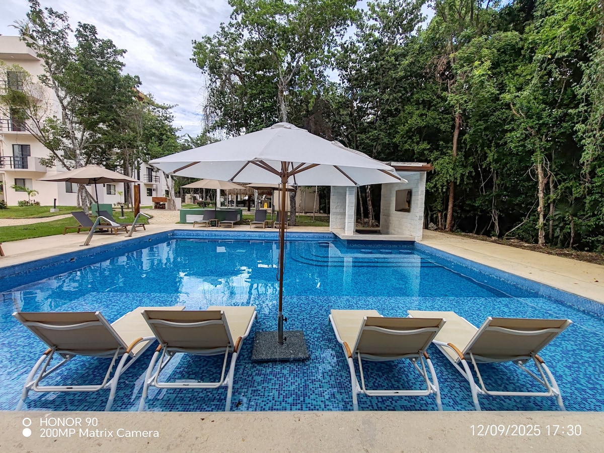 Departamento en planta baja, en Puerto Morelos ubicado a solo 3 minutos de la playa caminando. Una habitación con cama queen size y un sofa cama en la estancia. Acabados de lujo en el departamento, y cuenta con un rooftop con una vista al mar caribe espectacular, alberca de 12 mts de largo y área de pergolado para disfrutar la vista con un vino o una cerveza. Restaurantes con excelente gastronomía a unos pasos del edificio.
