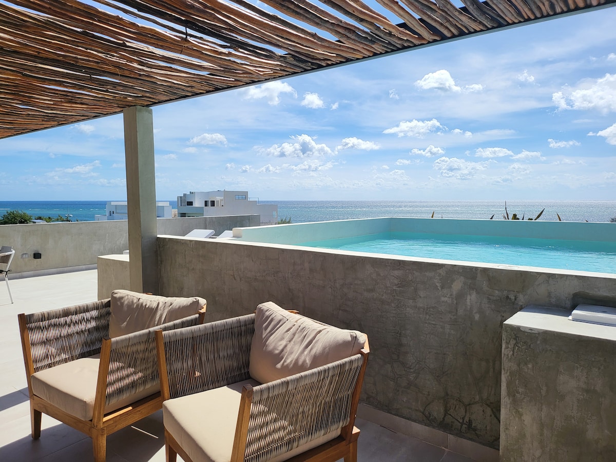 Luxury Oceanview Studio – Rooftop Infinity Pool! Brand-new studio in Puerto Morelos! Perfect for two, stunning views from a private balcony, modern interiors, and premium amenities. The Space • Stylish studio with partial ocean views • Private balcony with lounge seating • Kitchen with essentials • Luxury bathroom with toiletries • Air conditioning • WiFi Building & Location • Rooftop infinity pool • Steps from beach & dining • 25 min from Cancun Airport Book now!