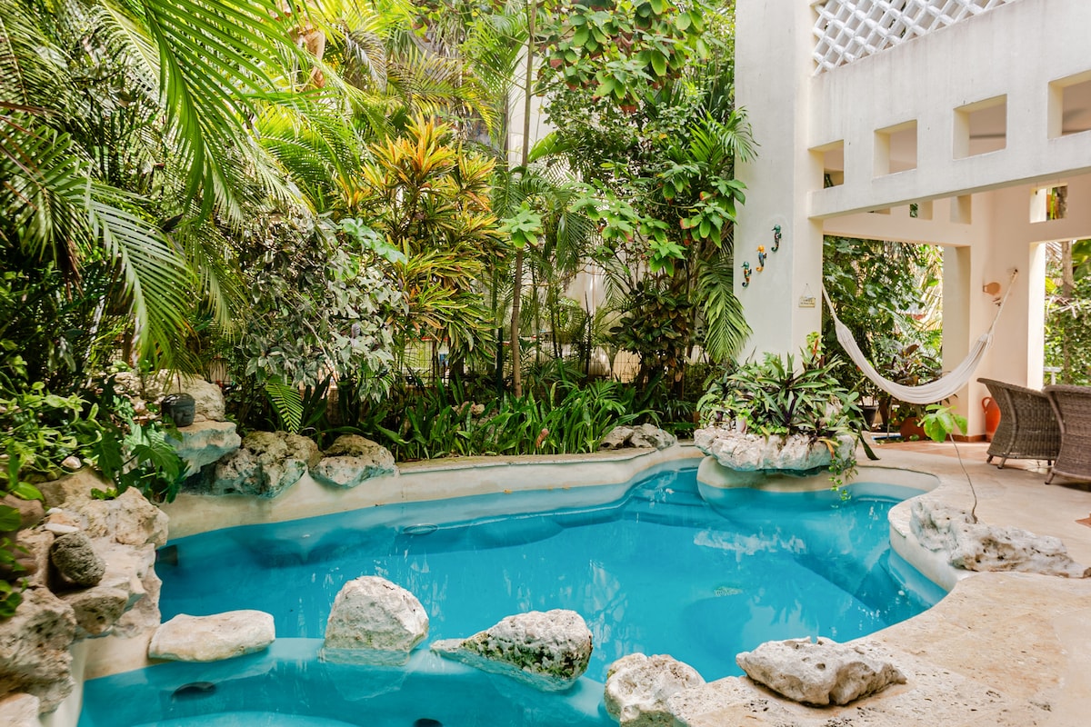 Discover your dream vacation home just 150 meters from the beautiful beaches of Playa del Carmen! And just a 10 minute walt to the ferry and 5th ave. This three-story Mexican-style residence blends comfort and coastal charm. . The outdoor area includes a cenote-style pool and lush landscaping