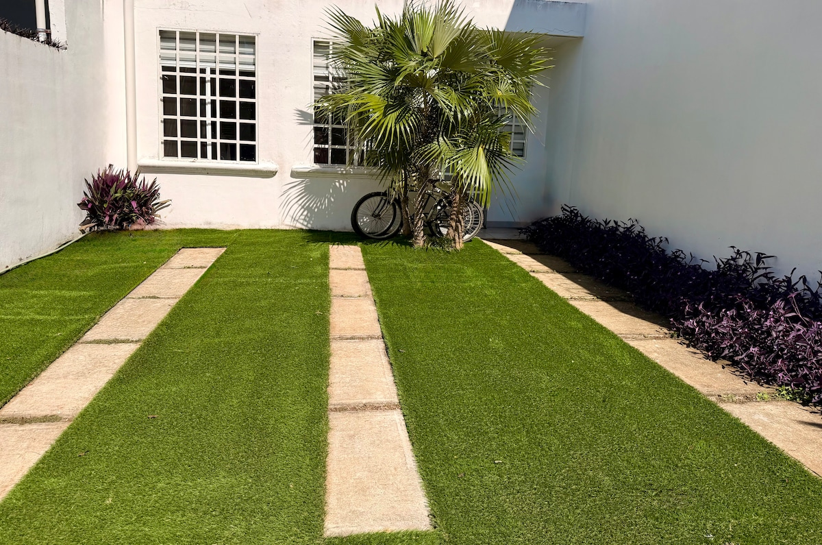 Centrally located house across from the Chedraui supermarket. One block from the beach and the main square. It features a front terrace and a lovely tree-lined yard for barbecuing or socializing outside. A long desk is available for working from home. Ideal for taking walks due to its proximity to the beach and Puerto Morelos' most popular restaurants. Wheelchair access to all areas and even the supermarket. The patio area is secure and fenced for pets. Both bedrooms have air conditioning.