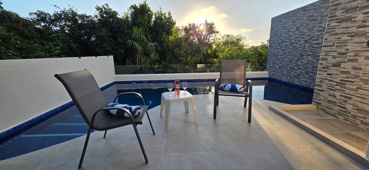 Casita Granada located private and quiet complex of Casita Blanca, with a pool just outside your door is a beautiful luxurious 3 bedroom, 2.5 bathroom, ground floor condo with amazing views to the ocean and and adjoining private patio with a table and chairs for you enjoy your privacy. Steps away from the white powdered sandy beach in the best beach front location of Puerto Morelos. The condo in located 10 minutes away from the main square.