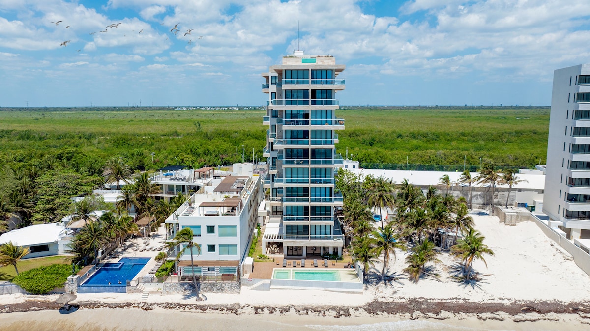 Relájese en este refugio único y tranquilo ubicado en Distrito Morelos, hecho con lujo , una hermosa vista, sonido de las olas del mar, estacionamiento, cuenta con dos albercas, una en el roof y la otra en planta baja con un jacuzzi, area de bbq gimnasio, espacio de co-working y un carrito de golf eléctrico para poder explorar los alrededores , incluido para uso exclusivo de nuestros huéspedes. Licencia: 11242959