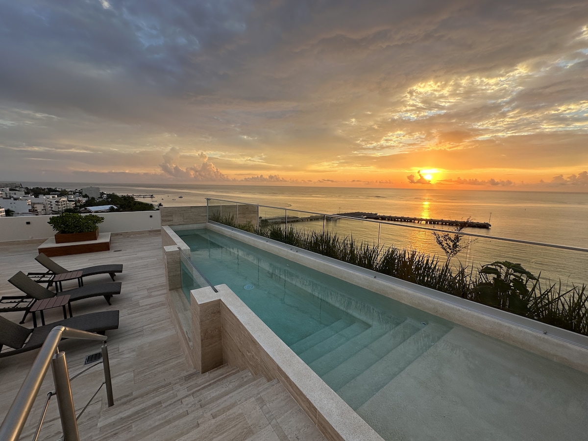 Beautiful condo at Distrito Morelos, located on the 7th floor with panoramic views from every room. Features high-speed WiFi and direct beach access just steps away. Enjoy two pools: a rooftop pool with tables and seating, and a beachfront pool on the ground level. Located in the heart of Puerto Morelos, within walking distance to restaurants and shops. Perfect for a relaxing Caribbean getaway in a prime location.