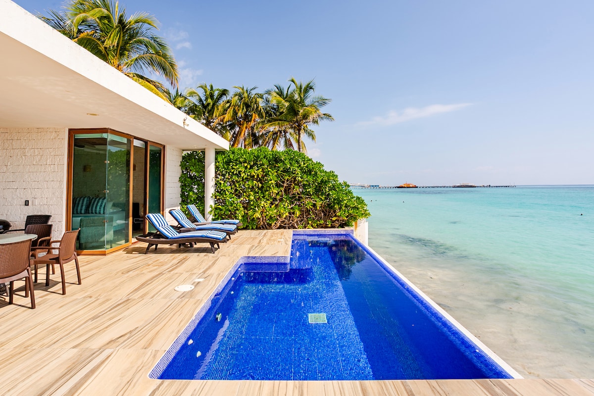 Exclusive Family Beach house 50 feet sandy beach front, private pool, Classy modern, large spaces, high ceilings, fully air conditioned, Ocean view and private access, 4 rooms with balcony, TV room, Netflix, terrace with Bar & barbecue by the pool in front of the beach. 5 blocks from Puerto Morelos main square, where you will find restaurants, mini market, shops, bars, masajes, Snorkel tours, etc... in front 600yds from the reef & México´s taste.