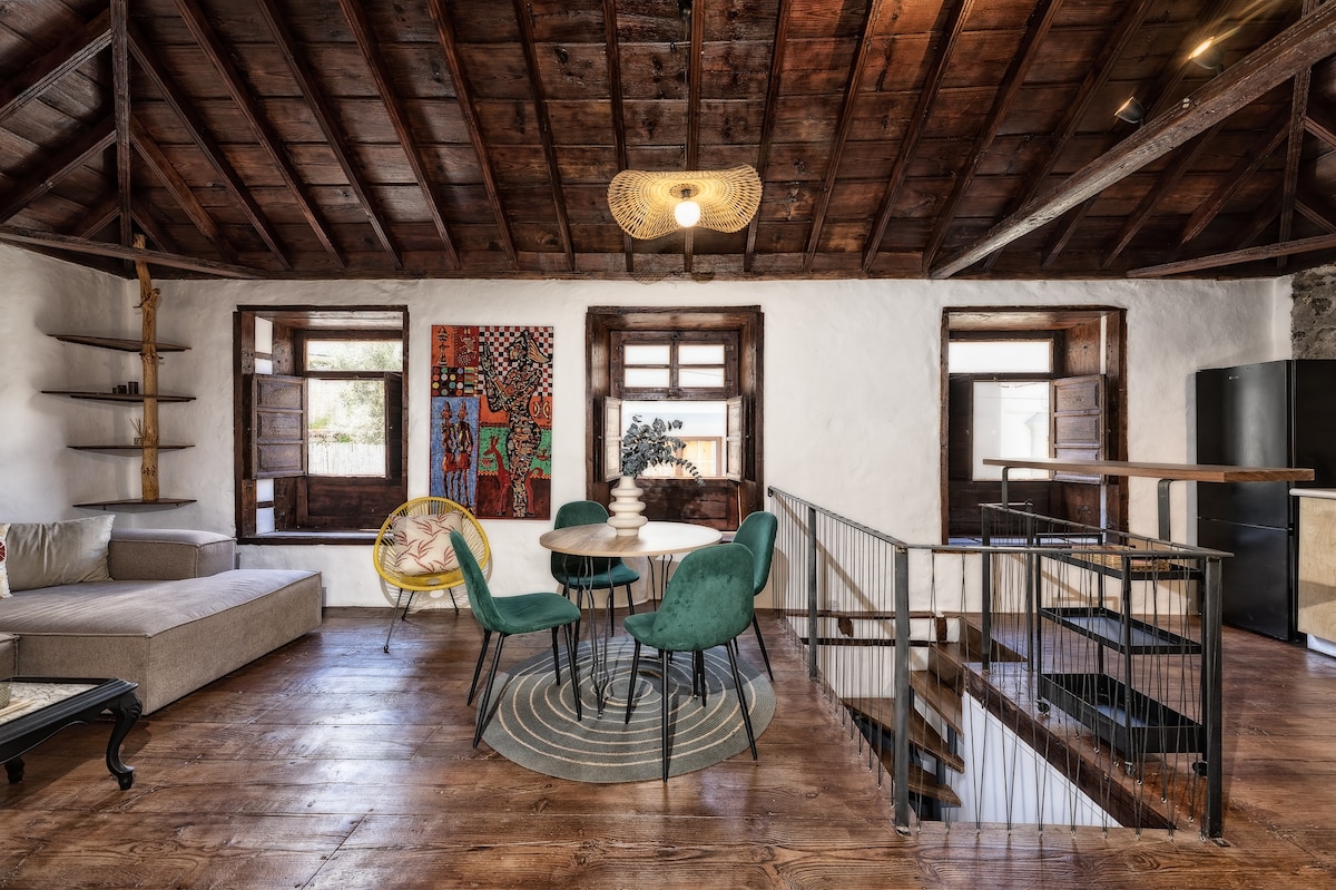 Casa renovada de dos plantas de estilo colonial, con grandes ventanales. El alojamiento se encuentra en el centro del pueblo de Tazacorte. En la planta baja se encuentra el comedor, la cocina, un baño, un dormitorio y un pequeño balcón. En la planta superior hay una sala de estar con sofá cama, otro baño y una terraza amueblada con impresionantes vistas al pueblo de Tazacorte, a sus montañas y riscos, pero sobretodo espectaculares vistas a las plataneras que se extienden hasta mar.