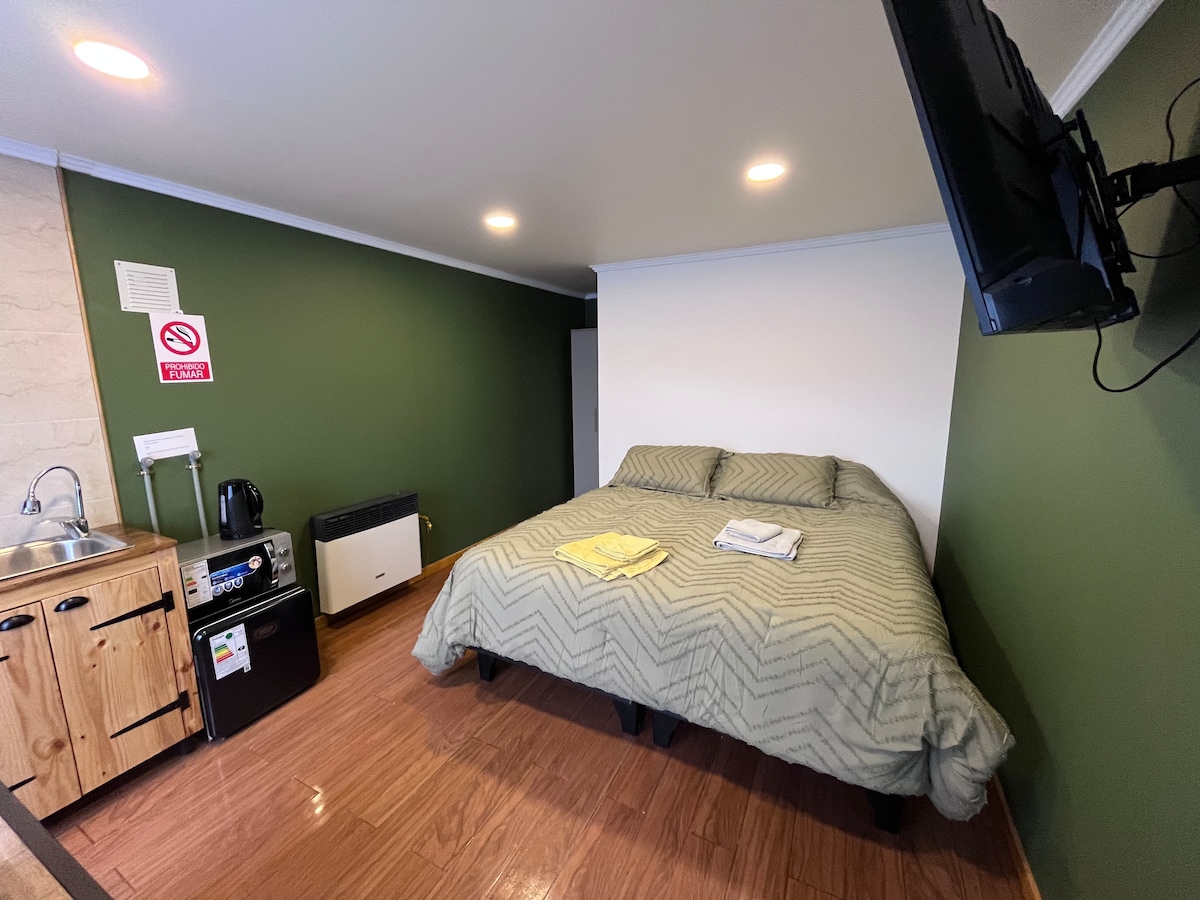Acogedor mono ambiente de 18 mts 2 con entrada independiente, para 2 personas, cama matrimonial (2 plazas), cuenta con baño privado, cocina equipada, hervidor, microondas, frigobar, calefacción central, agua caliente, Wifi, tv y netflix. Incluye ropa de cama, toallas y amenities (shampoo, acondicionador y jabón). Este alojamiento esta ubicado dentro de Puerto Natales, muy cerca del Polideportivo de la ciudad. A 15 minutos caminando al centro o terminal de buses.