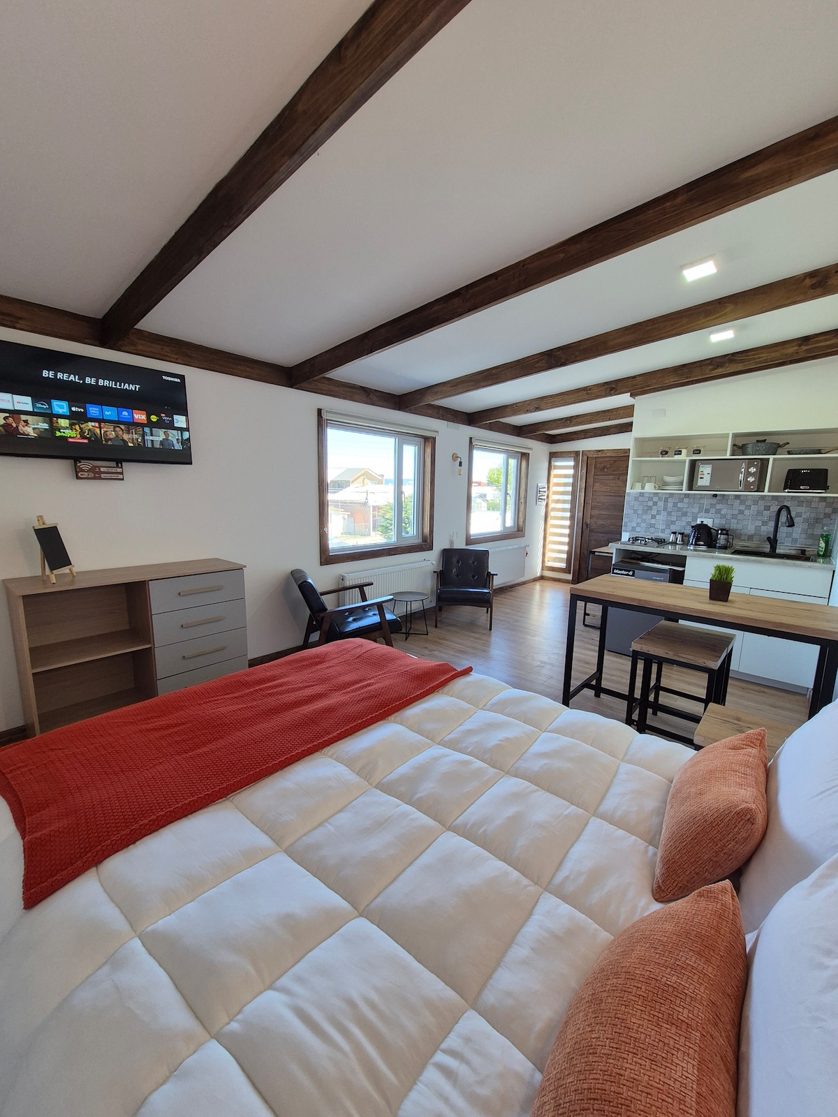 Disfruta de una escapada cómoda y tranquila en nuestra acogedora cabaña monoambiente, ideal para parejas o viajeros solitarios. Ubicada a pocos minutos del centro, combina la cercanía con todo lo que necesitas y la privacidad de un espacio propio. La cabaña está totalmente equipada y preparada para el frío de la Patagonia, con excelente aislación y calefacción. Ven a disfrutar de Puerto Natales, ¡Te esperamos con la calidez que necesitas!