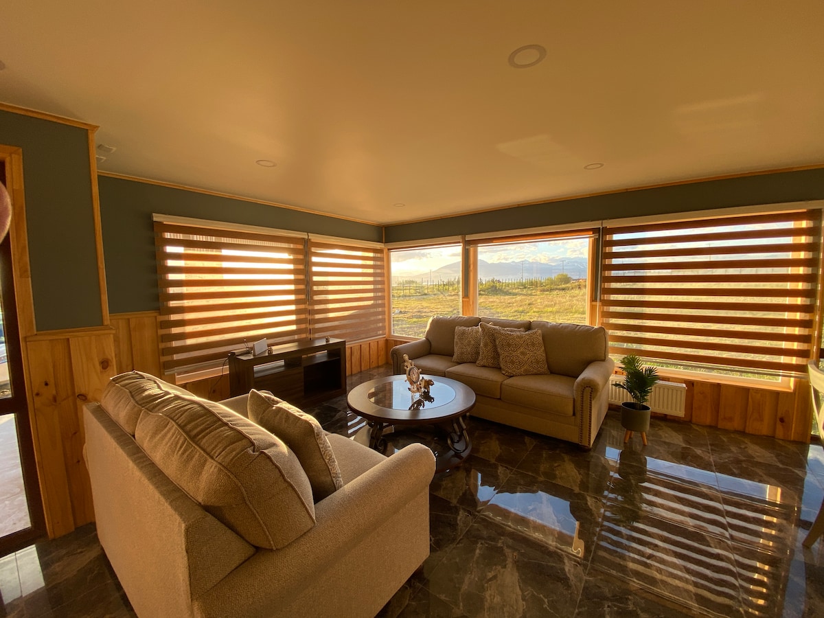 Una casa familiale recién construida en el campo , a 10 minutos en auto del centro de la ciudad, y 5 minutos de la terminal de buses, con un panorama amplio sobre el canal Ultima Esperanza , Puerto Natales , el glaciar Balmaceda y el Dorotea. Podrán disfrutar de esta hermosa vista y descansar como si estuvieran en su propia casa. Son los bienvenidos.