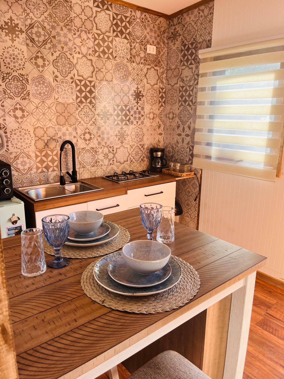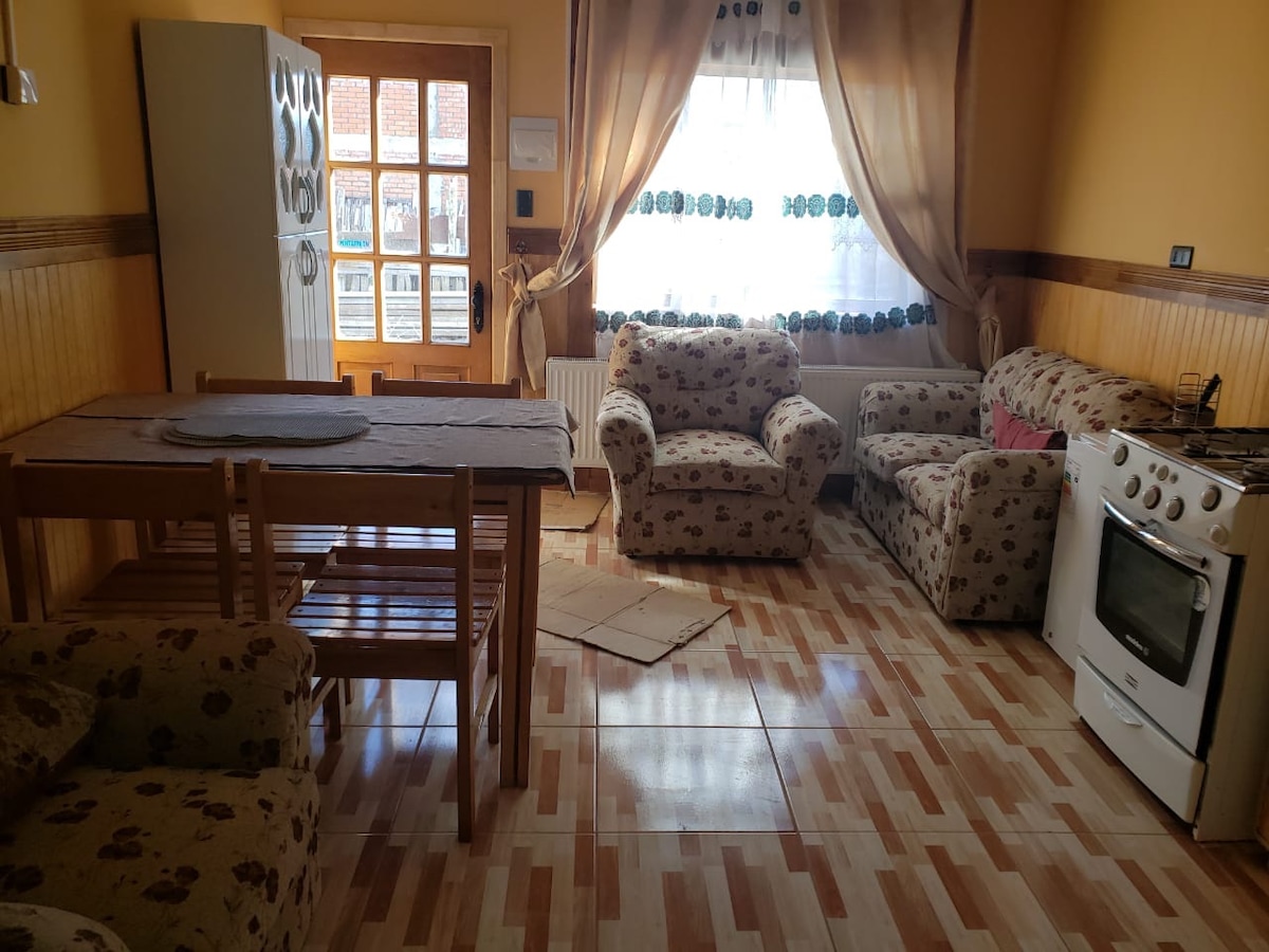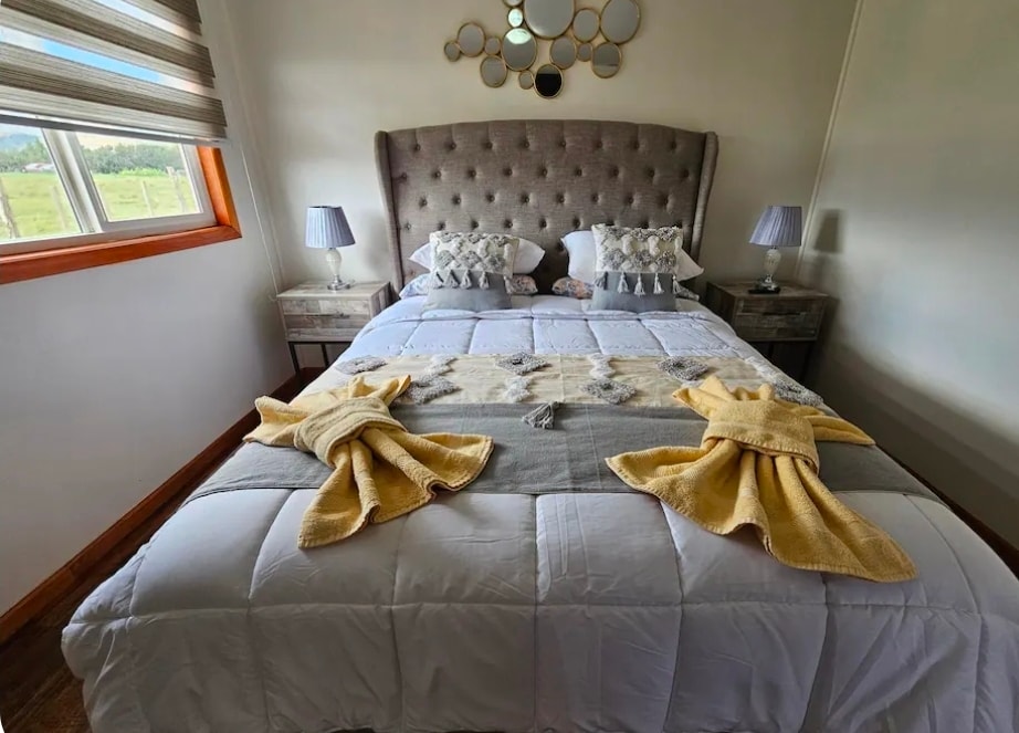 Acogedor espacio para 3 personas, cuenta con una cama de 2 plazas y una cama de 1 plaza y media, cocina equipada con todo lo necesario para la preparación de alimentos, baño completamente equipado incluye lavadora, secadora, ducha, secador de pelo y otro. Para tu entretenimiento cuenta con naipes, juegos de mesa, información y libros turísticos, smart tv con aplicaciones de streaming, a demás wi-fi propio de la cabaña. Esta ubicada a 10 minutos del centro, a dos cuadras de la estación de buses.