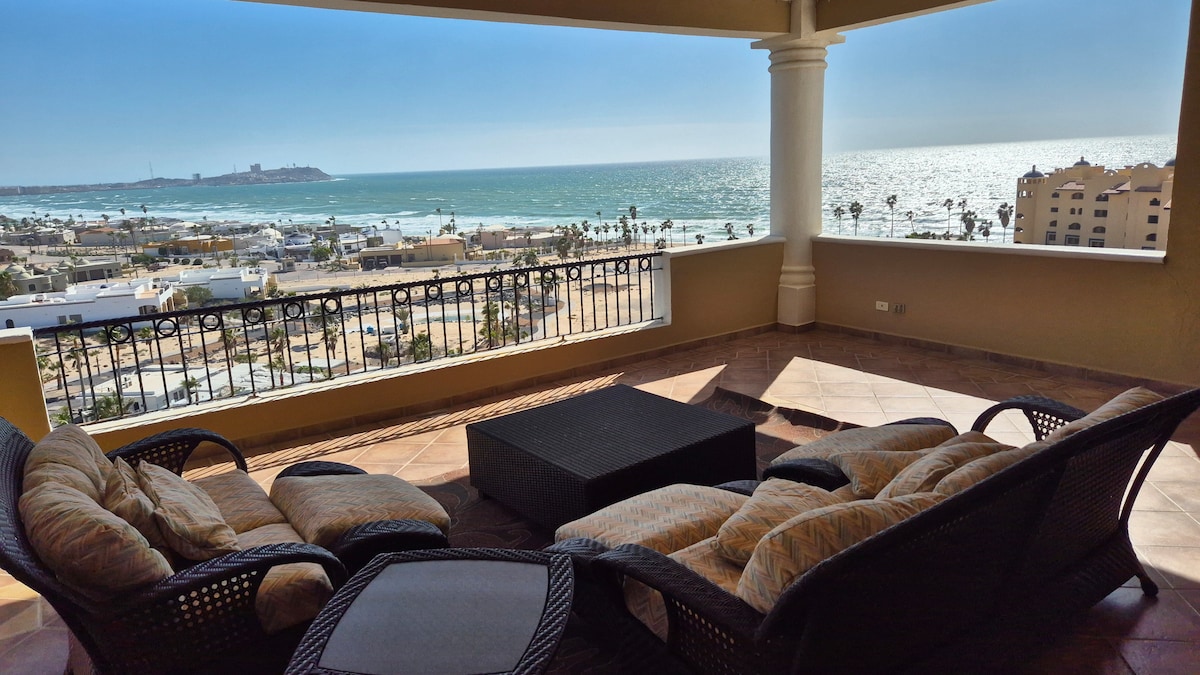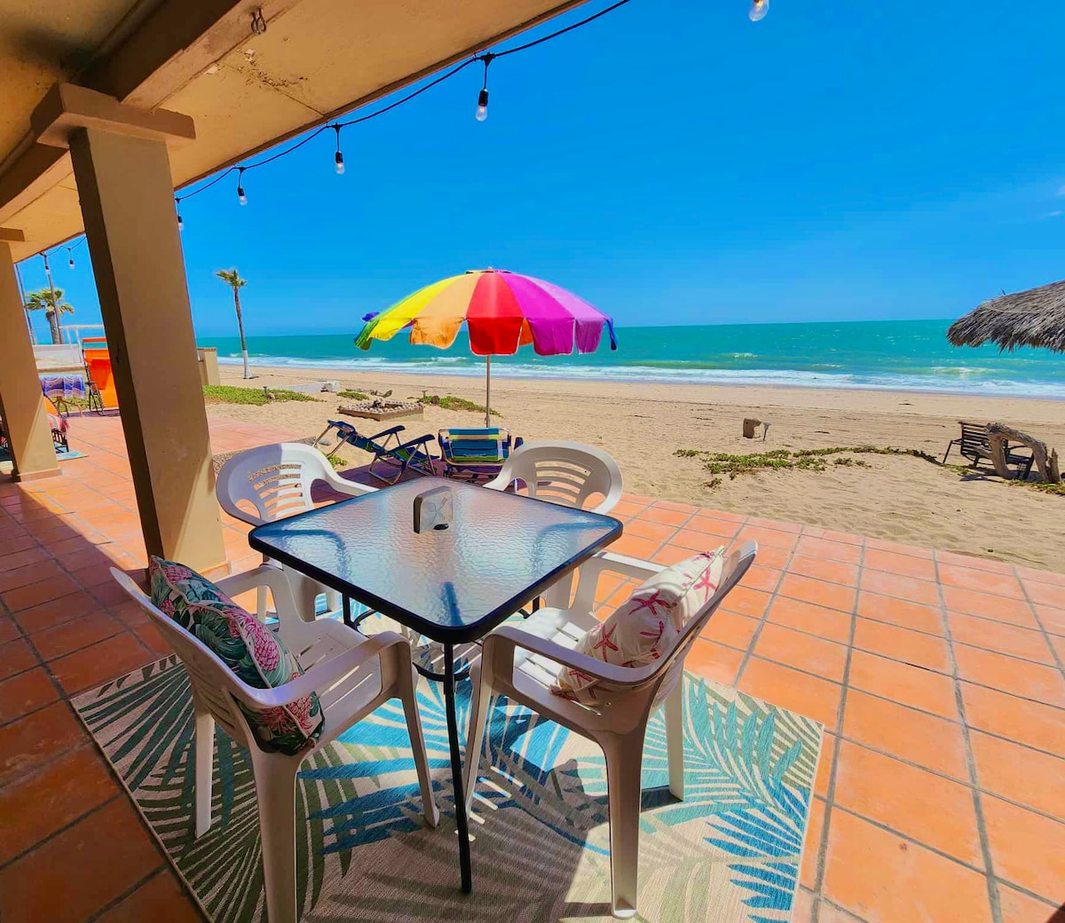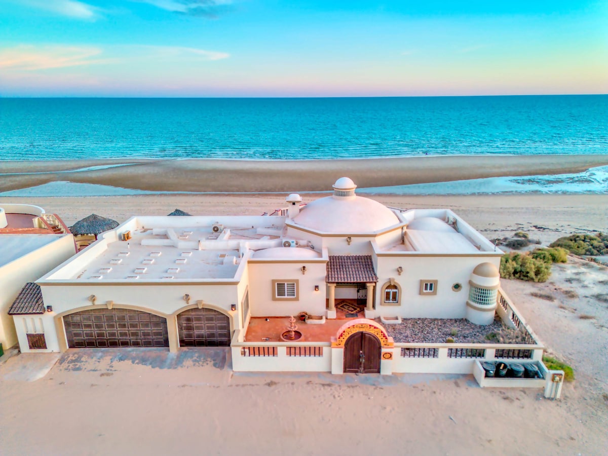 Beautiful beachfront villa on the Sea of Cortez with fast internet service! Centrally located on Playa Mirador, this 3 bedroom 3 bath home is within a short walking distance of Manny's Beach Club, Pitaya Bar and Pink Cadillac. Spend the day on the beach, then unwind and watch the sunset from the large patio with lounge chairs, firepit and BBQ grill. The home is perfect for entertaining with a shuffleboard and foosball tables, two 50" smart TV's and a fully stocked kitchen.