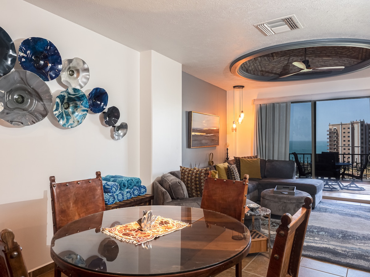 *SONORAN SUN 1BR 1 BATH * ON SANDY BEACH * Relax, Refresh and Recharge... Your Home away from Home. Newly Listed and highly upgraded, this 1 BR ,1 BA condo offers stunning views of the Sea of Cortez. It is decorated with a modern Boho interior and it is ideal for couples or families. Rising directly above Sandy Beach, this Luxury Ocean Front Resort is ideally located near Restaurants, shops and bars. This a 24 Hr guarded gated Resort with Pool Bar, Restaurant, Gym & Spa.