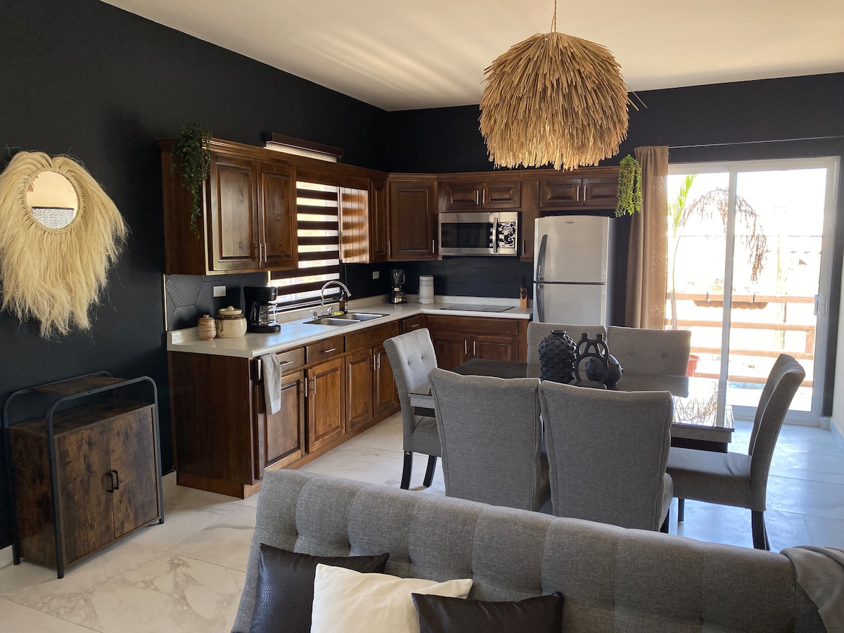 Escape to this stunning apartment located in downtown Puerto Peñasco, just steps away from the marina, the Malecon and some of the best beaches in the area. Boasting a unique and vibrant tribal boho African decor, the balcony with amazing views of the surrounding area. With one king bed, two full beds, and two sofa beds, this spacious apartment can accommodate up to 8 guests and is perfect for large families or groups of friends. We have free gated parking too!