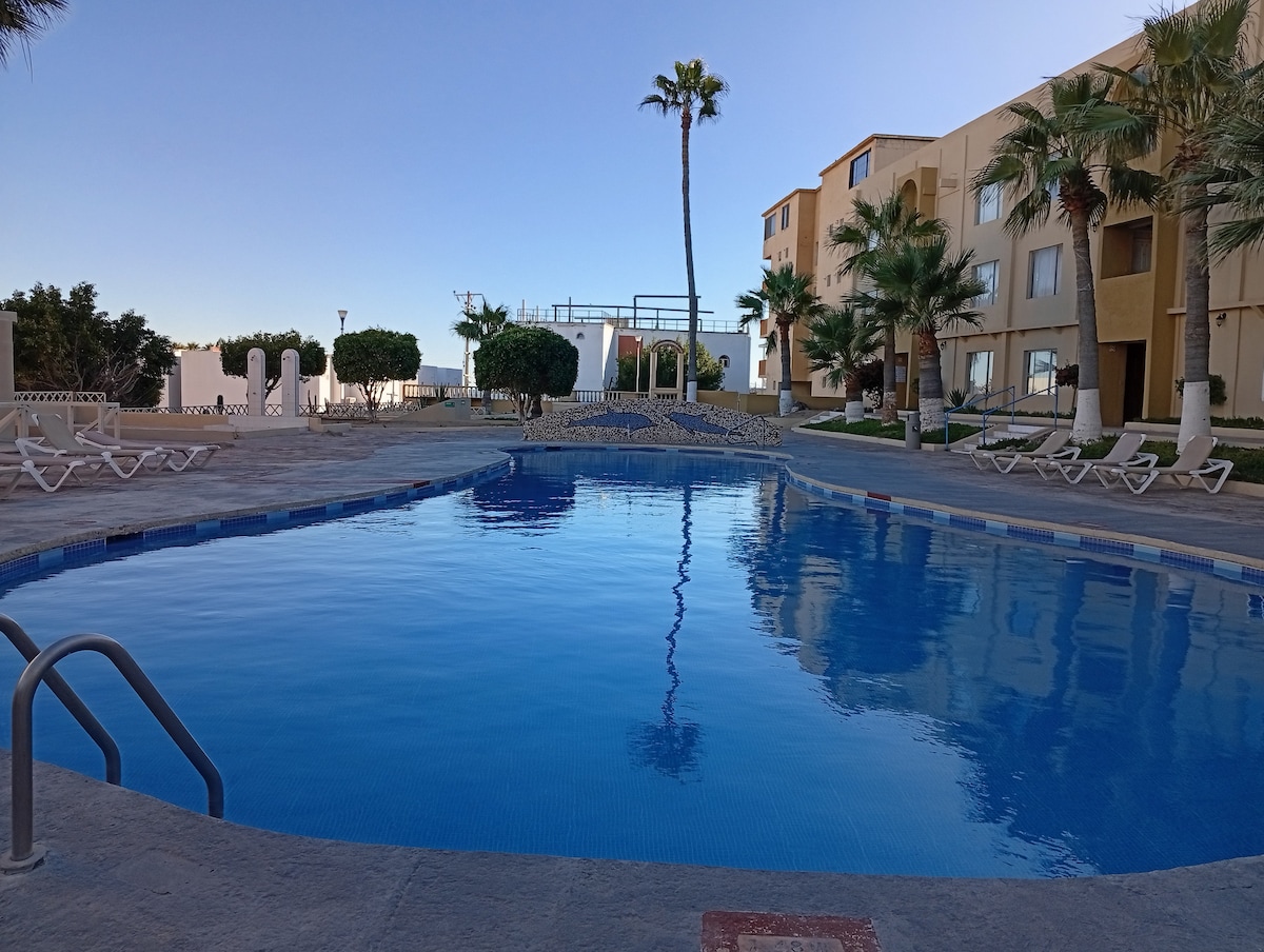 Newly remodeled condo with new furniture and appliances in Casa Blanca, Sandy Beach area. It’s a short walk through the Resort’s pathways of the 18-hole putting golf course to the beach. Enjoy one of the three Resort’s pools, the beach or just sit relax on the condo’s spacious patio with a wonderful view of the town and Sea of Cortez. Condo has a comfortable layout, is nicely decorated and equipped for a perfect stay. Direct tv provided to LR & Mr br. Smart tv in br 2 for streaming.