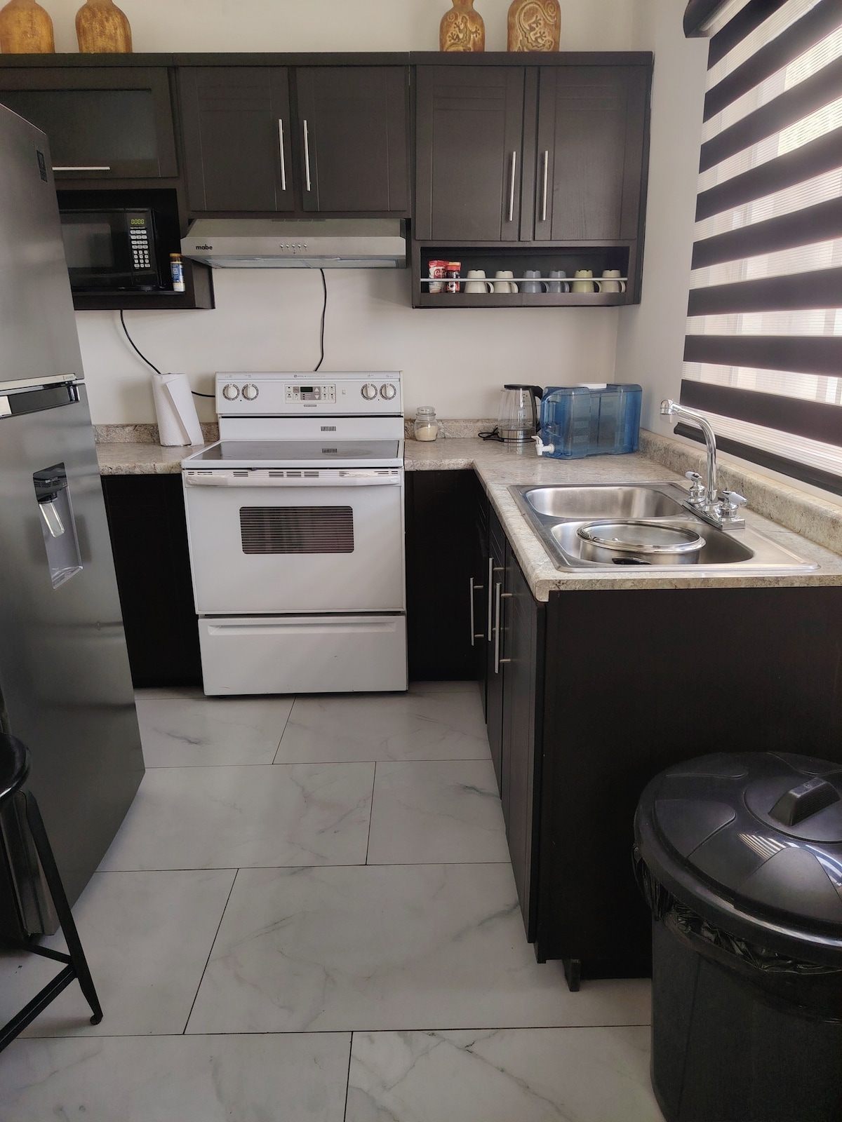 Este es un estudio pequeño dentro de una propiedad con una casa en el mismo terreno (mi abuela vive en esta casa), se c omparte el estacionamiento pero es grande, es cómodo, pequeño pero muy seguro, limpio y en una muy buena ubicación tiene un baño equipado, una cama, cocina pequeña donde pueden cocinar también muy equipada con todo lo necesario para su comodidad, la ubicación es muy buena cerca de playa mirador, de malecón, bancos, cruz roja, restaurantes entre otras cosas.
