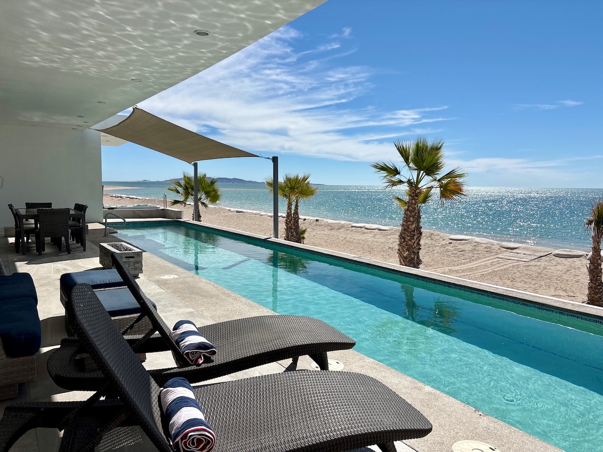 Beautiful beachfront villa on the Sea of Cortez with fast internet service! Centrally located on Playa Mirador, this 3 bedroom 3 bath home is within a short walking distance of Manny's Beach Club, Pitaya Bar and Pink Cadillac. Spend the day on the beach, then unwind and watch the sunset from the large patio with lounge chairs, firepit and BBQ grill. The home is perfect for entertaining with a shuffleboard and foosball tables, two 50" smart TV's and a fully stocked kitchen.