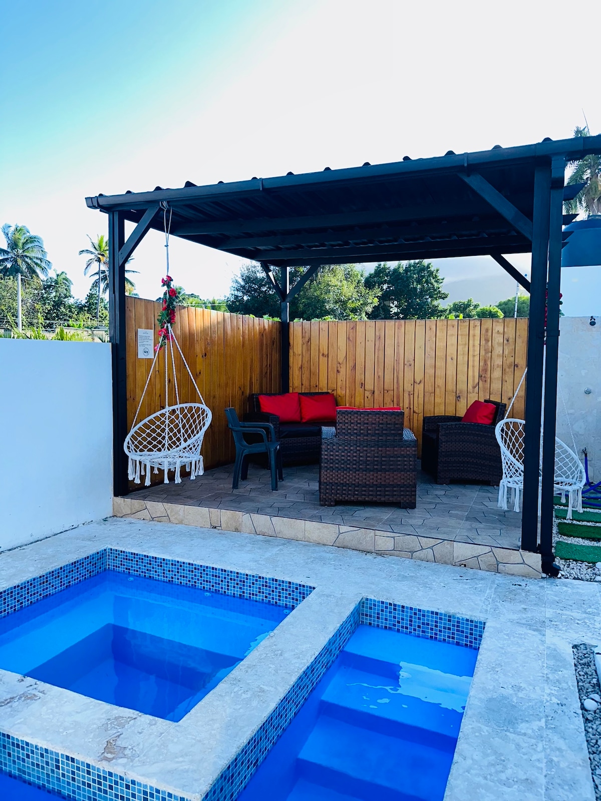 Sunview Villa is the perfect place to retire away from the city and enjoy your deserved vacation relaxing with your friends or family. In our private patio you have a wide space to share; roofed terrace with a 55" TV with Stereo System, BBQ area, patio with table, and our great pool & cascade and hot jacuzzi! 10 minutes away from the airport, 10 minutes away from the city center, and 5 minutes away from Playa Dorada, Our Villa is perfectly located! Chef service available! Events organization!