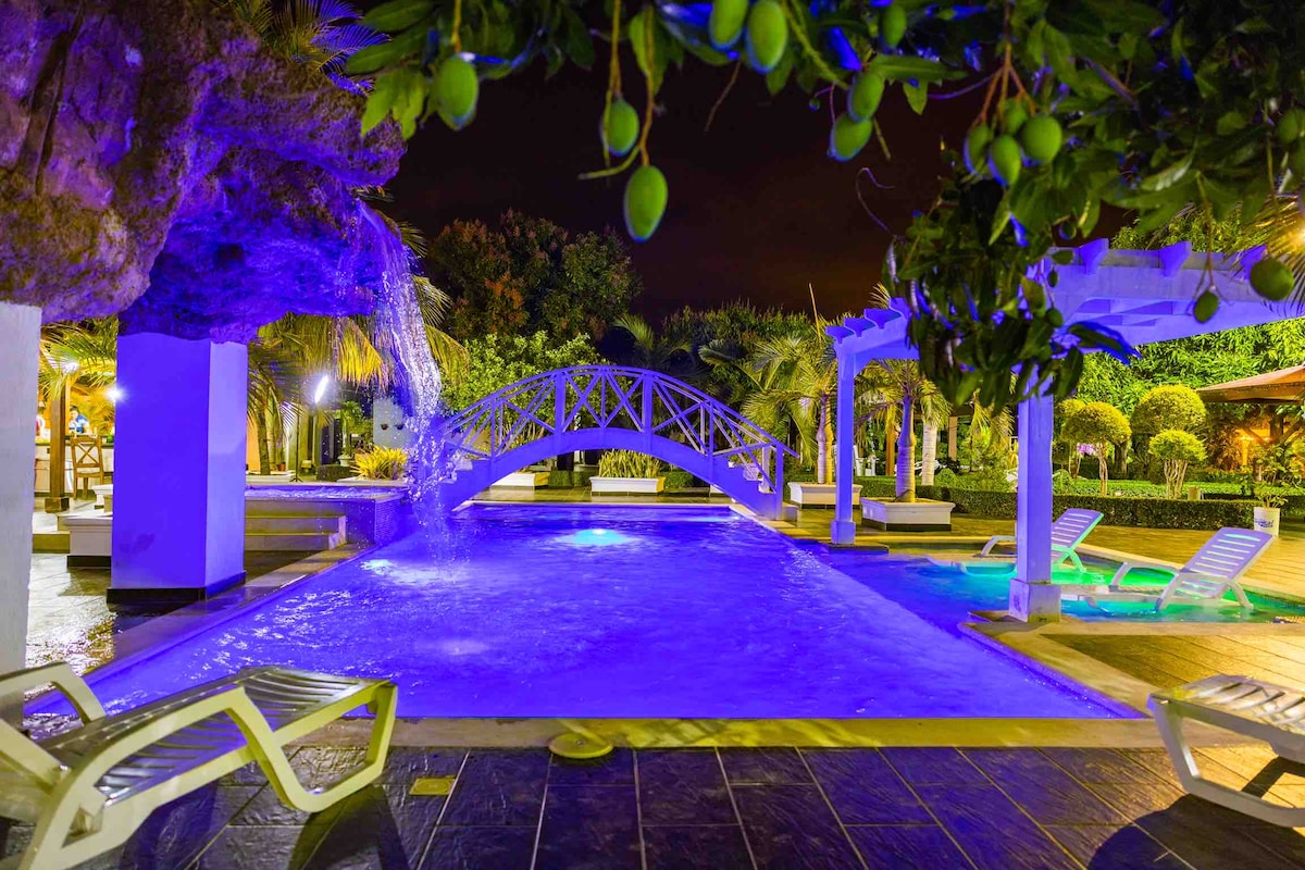 Sunview Villa is the perfect place to retire away from the city and enjoy your deserved vacation relaxing with your friends or family. In our private patio you have a wide space to share; roofed terrace with a 55" TV with Stereo System, BBQ area, patio with table, and our great pool & cascade and hot jacuzzi! 10 minutes away from the airport, 10 minutes away from the city center, and 5 minutes away from Playa Dorada, Our Villa is perfectly located! Chef service available! Events organization!