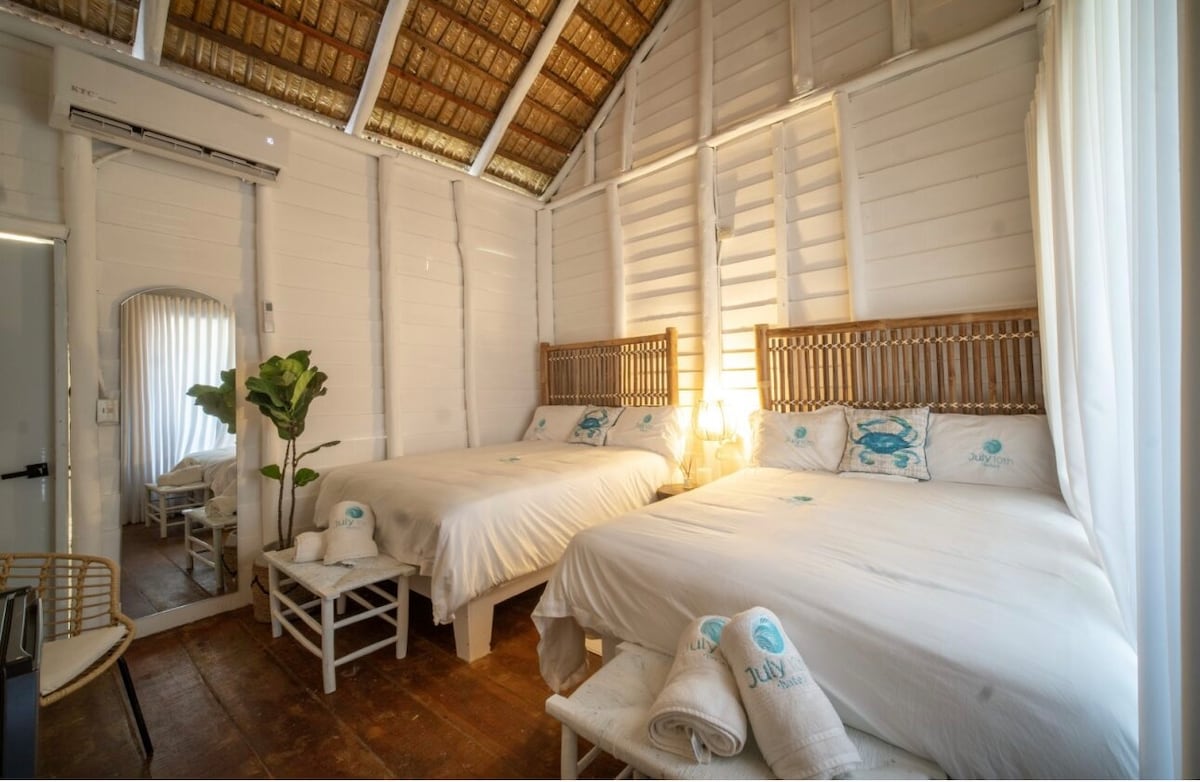Perfect for families or small groups, our two-bedroom beachfront suites offer comfort, privacy, and stunning ocean views. Each unit includes two cozy bedrooms, a shared living space, private bathroom, and a balcony or terrace just steps from the sand. Wake up to the sound of the waves, enjoy direct beach access, and explore nearby restaurants and Cayo Arena excursions. With laid-back Caribbean charm, your stay at Hacienda Del Mar feels like home by the sea.