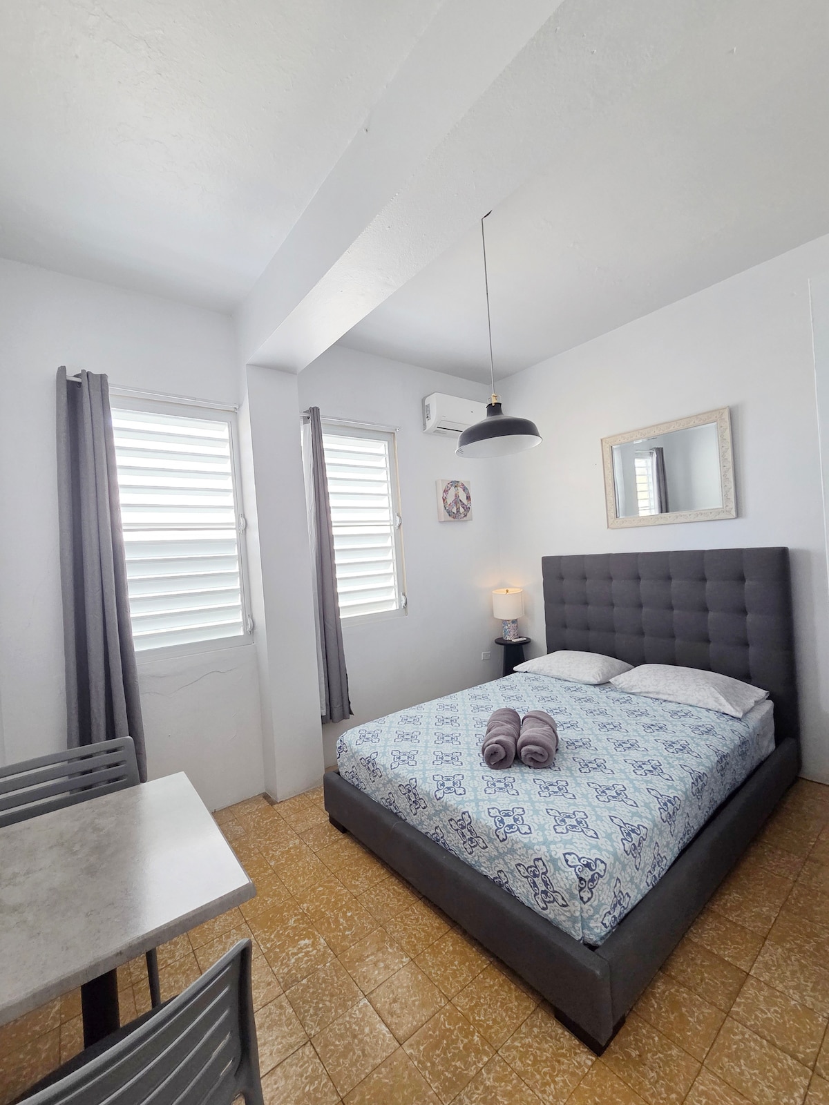 Perfect location and good spot for surfers, backpackers, tourist, locals, couples and solo travelers. Located in a second floor, home (hostel) with 4 new bedrooms (rented separately) and 2 new shared bathrooms, with an urban vibe. Great Price for the coziest bedroom, table fan. Clean, safe and in downtown Aguadilla. Wifi Available! Near Malls, Wallgreens, Kmart, beaches and airport, Walking distance to the beach. Fit 2. It's downtown Aguadilla and city life can be noisy.