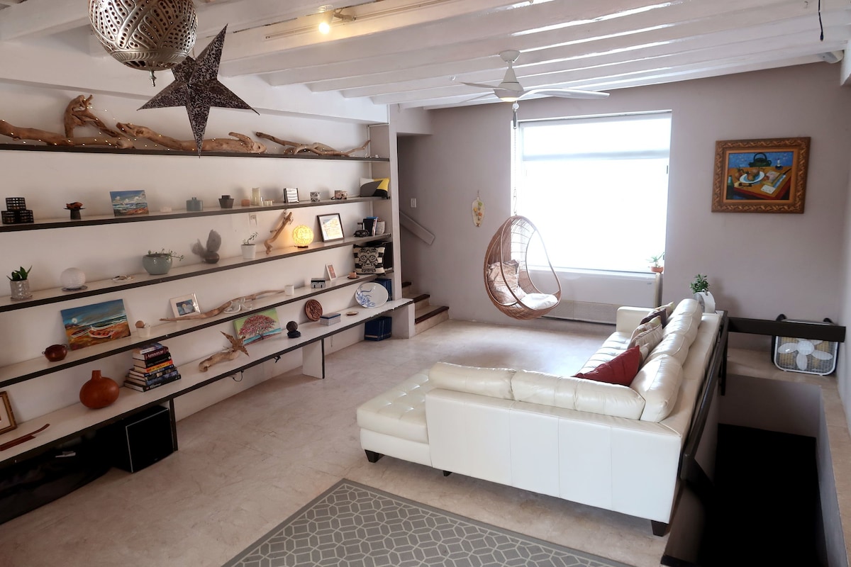 Welcome to Dirk's Loft at Cava's Place located right on the beach of Luquillo. A colorful, tropical beachfront house full of art, amenities and a great vibe. Large sliding door on the bedroom, that when opened, it's like sleeping in the sky just a few feet from the ocean. Double doors open from the living room to take in the unique pool just outside your door.