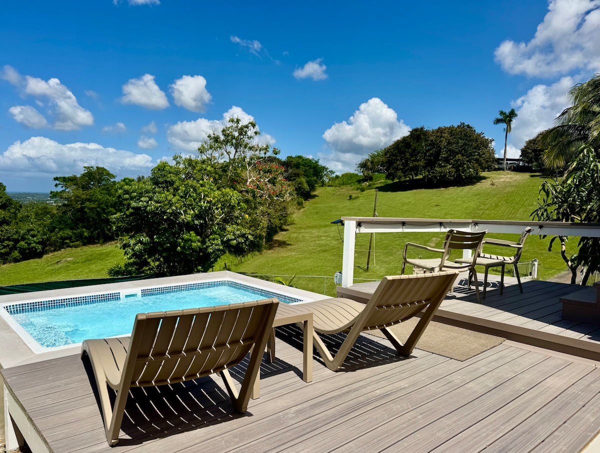 Enjoy the lovely setting of this romantic spot in nature and discover the serenity in our cozy farmhouse. This private villa wraps you in a lovely and peaceful environment with majestic mountains all around. The house is fully equipped for your convenience. It is ideal for couples in need of a nice getaway or just reconnect with yourself and nature. It is on a gorgeous tropical private 3 acre estate with private pool. Located in Villalba, Puerto Rico, just 50 minutes from Ponce's Airport.