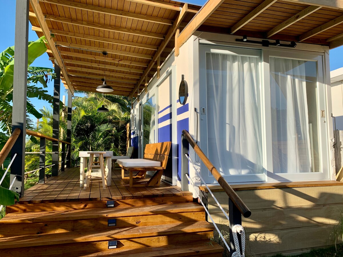 Enjoy this beautiful blue container surround by fruit trees on a private lot of land. Perfect private stay for 1-2 people. 2min WALK to the Beach 35min - SJU Airpot 25min - El Yunque 25min - Piñones 20min - Los Kiosks de Luquillo The enclosed lot can be secured and there is always plenty of street parking. You will find mango, mini-banana, breadfruit, lemon, acerola, passion fruit and papaya plants. If you come during the right season, you are more than welcome to pick from them.