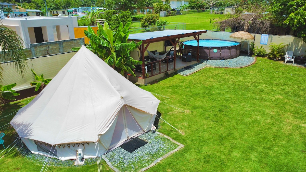 Disconnect from the routine and enjoy the tranquility of the countryside in the city of Guaynabo, Puerto Rico, with a private pool and different decks where you can relax. The tent has a cozy queen bed, one air conditioners, books and board games. You'll also have your private bathroom and outdoor area with bbq, refrigerator, pool and a cozy seating area.