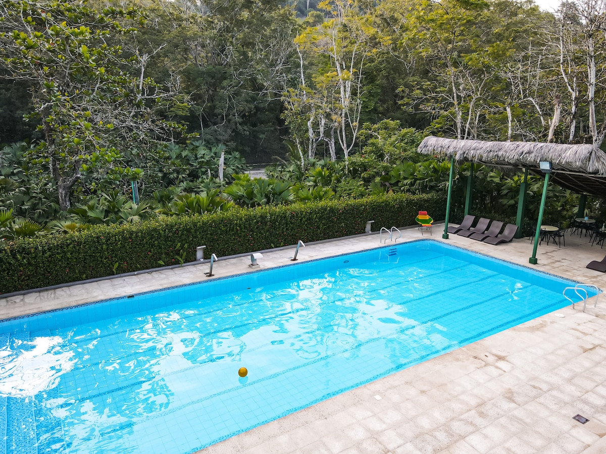 Apartamento adecuado para 8 personas, se encuentra ubicado en medio de una Reserva Natural en la cual encontrarás a pocos metros del alojamiento un rio de aguas naturales y cristalinas, además de una cascada que forma una piscina natural. Podrás disfrutar del avistamiento de fauna silvestre, tales como lo son los osos perezosos, primates, reptiles, aves, entre muchos otros que harán que tu estadía sea algo fascinante con el toque inigualable que la naturaleza te podrá aportar.