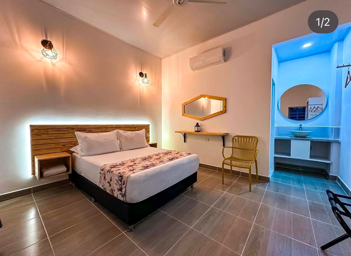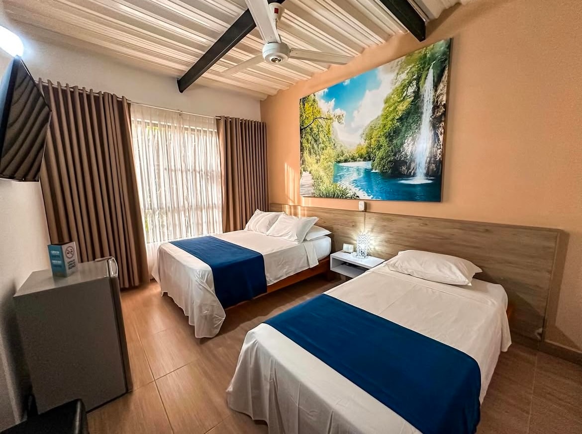 Somo un hotel moderno y cómodo, ideal para que disfrutes con tranquilidad tus días de vacaciones. Estamos ubicados a una cuadra del parque principal, a 10 minutos del Parque Temático Hacienda Napoles, a 10 minutos caminando del Santorini Colombiano y 20 minutos de la Reserva Natural Río Claro dónde podrás disfrutar de su bello paisaje y practicar distintos deportes extremos. El alojamiento incluye piscina, esta queda a 3 cuadras del hotel. Pueden ir caminando se demorarían 5 min.