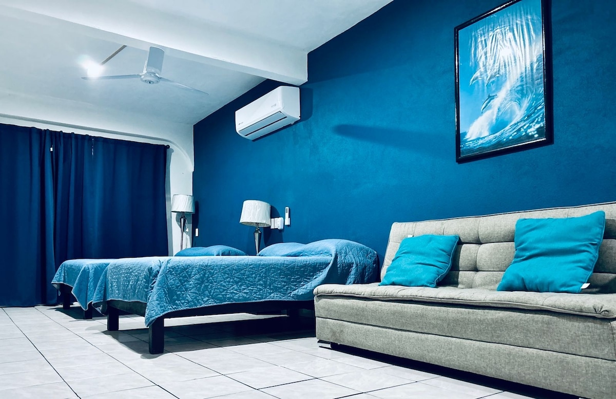 Disfruta de un acogedor departamento céntrico y a unos pasos de la playa. Ubicación privilegiada en el corazón del auténtico Vallarta. Bonito, luminoso, con balcón y una pequeña terraza. 2 recámaras con aire acondicionado, ventiladores y 1 baño completo. Nuestra cocina ha sido recientemente renovada con una barra más amplia y cómoda para cocinar. También contamos con un WIFI veloz con dos módem uno en la recámara principal y otro en la sala.
