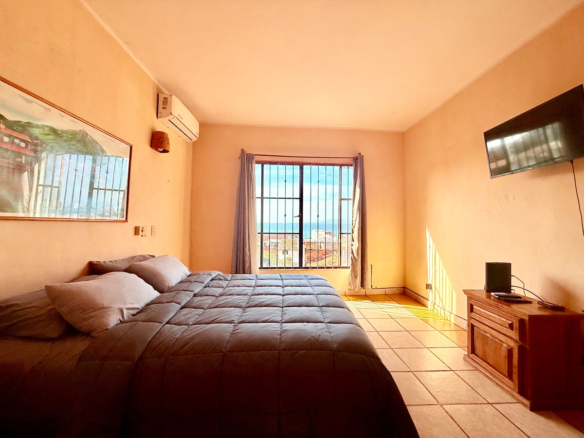 ★Breathtaking Views of the Bay ★SMALL shared dipping pool ★English TV USA-CAN Channels & Sports ★Very high-speed WIFI (200 Mbps) ★King Bed ★7 minutes walking to town ★Filtered Drinking Water ★ Free Parking ★Panoramic view of the Bay ★ We accept your pet less than 20kg/45lb (dog/cat) ★ AC in bedroom. ★ Uber to and from Old Town or the beach is only $2-3 USD ★Local Host, born and raised in PV ★The location is near the MARCELA Resort, Blue Chairs & Casa Cupula ★68mt² (723 sf) plus balcony