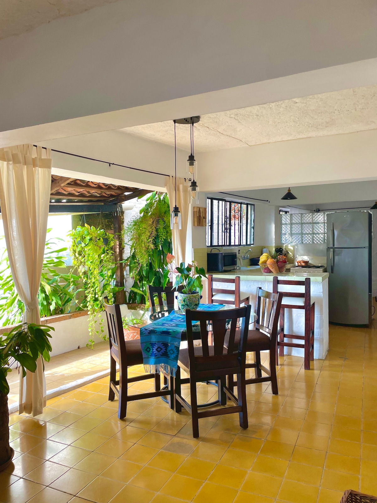 Coqueto Lodge estilo boho rodeado de un verdoso jardín tropical, hamacas, camastros y sillas playeras. Todo un buen comienzo para tu aventura vallartense. Ubicado en el Fraccionamiento Fluvial, una de las zonas más céntricas y exclusivas del Puerto, a tan solo 15 minutos a pie de la playa, así como de los centros comerciales La isla, Plaza Península, Plaza Caracol, La Comer y el Pitillal.