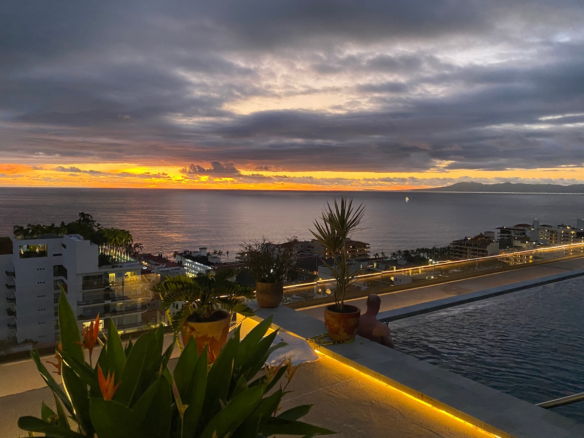 A spectacular PANORAMIC OCEAN VIEW Penthouse Loft steps from the BEACH and MALECON, with your own INFINITY POOL+all services and comforts, fully-equipped kitchen, AC, quality bed, waterfall shower, Wi-Fi, Smart TV, and the BEST VIEWS to admire Incredible SUNSETS and FIREWORKS every night, you may even find some Whales splashing over the Bay from your bed!! Walk to tons of restaurants, shops, art galleries, markets, or sunbathe at the many outdoor spaces, pools and decks... Welcome to Paradise!