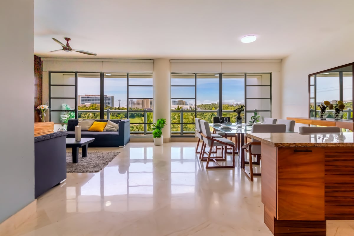 This modern brand new condo features 2 bedrooms, 3 bathrooms, and a studio, accommodating up to 6 guests! The wrap-around corner balcony offers stunning views of the pool, golf course, and Puerto Vallarta sunsets. Located in the brand new VGolf tower, providing the perfect setting for outdoor living and relaxation. The open-concept living area combines dining and living spaces, and it comes fully equipped to ensure a comfortable and enjoyable stay. We look forward to your upcoming stay!!