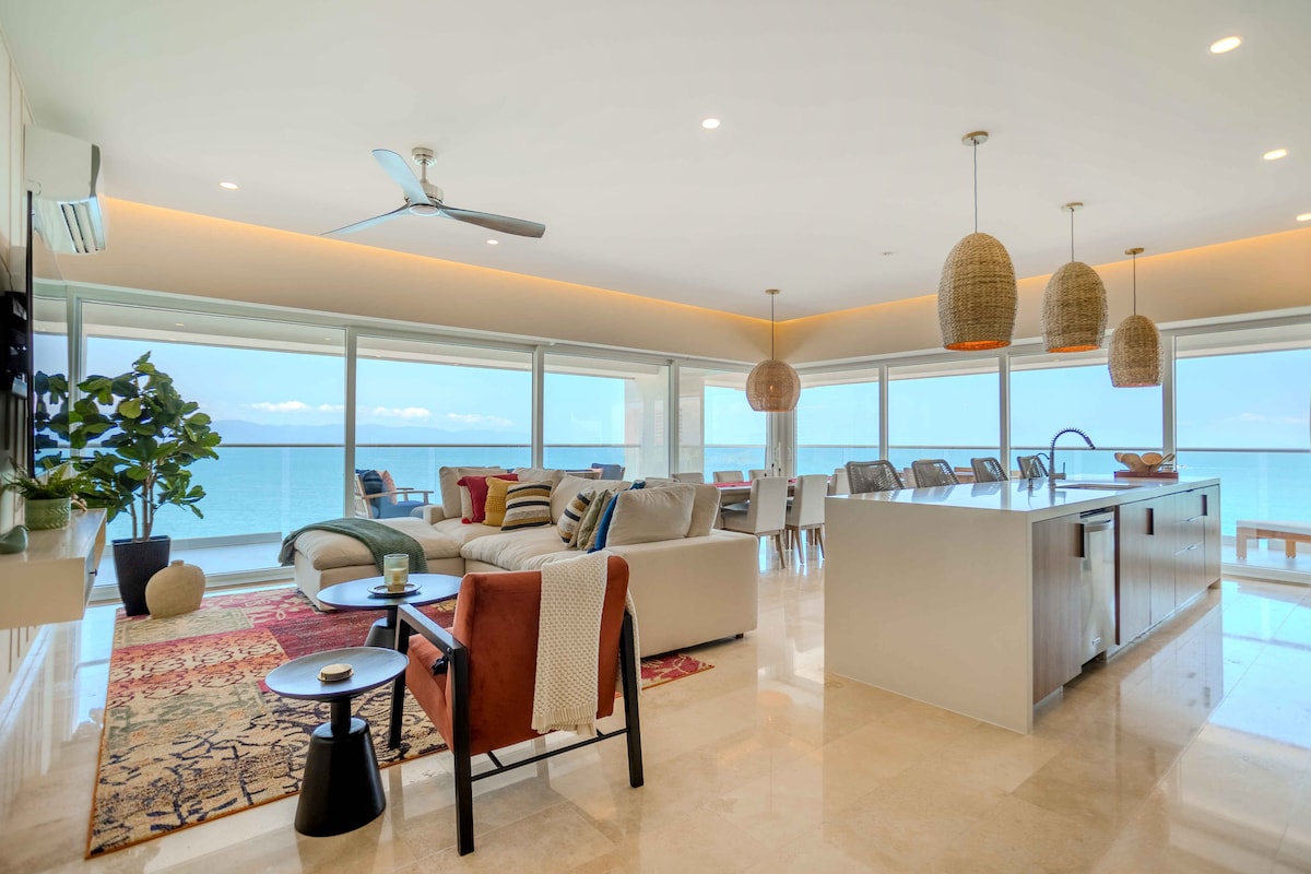 Luxurious 3000 sq ft condo with breathtaking oceanfront views, superior location in Conchas Chinas and full service amenities on site . It is the newest of the Sayan properties and a sought after address. The complex has an infinity rooftop pool, infinity lower pool, hot tub , full service bar and restaurant at both pools and a huge gym, massage and steam room available for all guests. The complex is a few steps to beach and a 15 min walk into Old Town. LOWER POOL CLOSED MAY 7-July 10