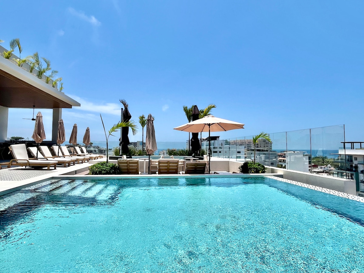 Experience modern Mexican luxury at Zapata del Mar in the exciting new SohoPV, at the ❤️ heart of the Romantic Zone. This Oaxacan inspired condo, is only 6 blocks from Los Muertos beach 🏖️ and at the center of PV’s restaurants, trendy bars, galleries & entertainment venues. Enjoy the iconic rooftop infinity pool 🌊with panoramic views or unwind on your large private balcony with city & ocean views. Building amenities include sun beds, cabanas, lounges, fire pit, gym, rooftop infinity pool and bar.
