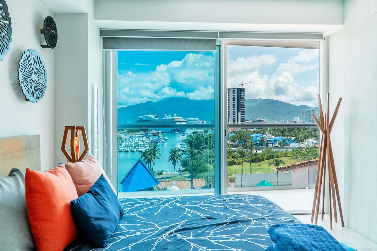 Disfruta del lujo y la comodidad en el corazón de Marina Vallarta. Ubicado en el piso 7, este exclusivo condominio ofrece una experiencia funcional y moderna con una de las mejores vistas de la región. Desde tu balcón privado, podrás contemplar el movimiento de los yates, la iluminación nocturna de la marina, el despegue de aviones y la majestuosa Sierra Madre. • Espacios Integrados: Una sala luminosa con Smart TV de 65” que conecta con una habitación principal equipada con cama King Size